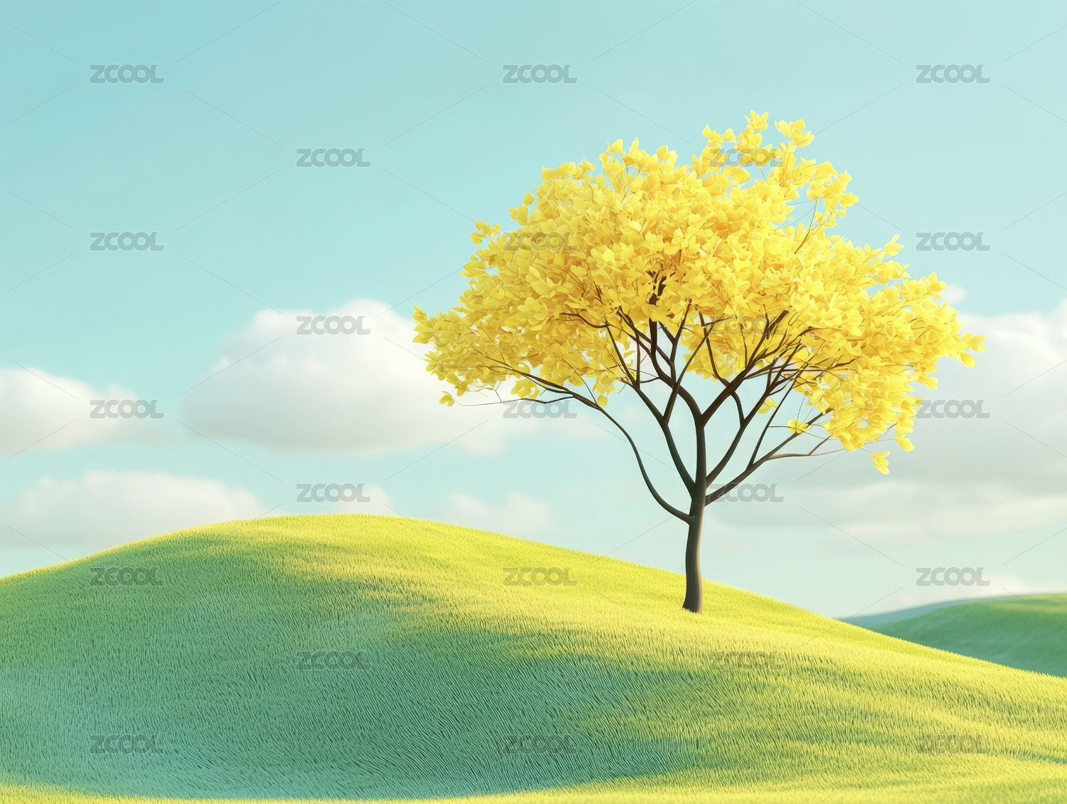 一个树在绿色山丘立秋秋分节气3D卡通插画