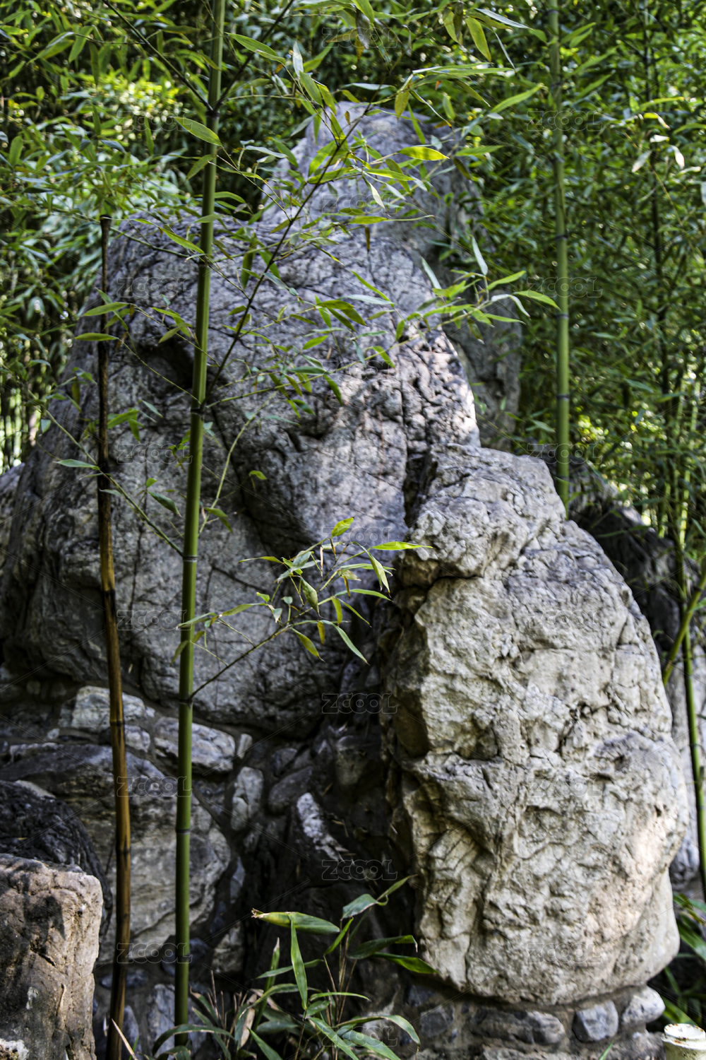 夏天公园里的绿竹与太湖石