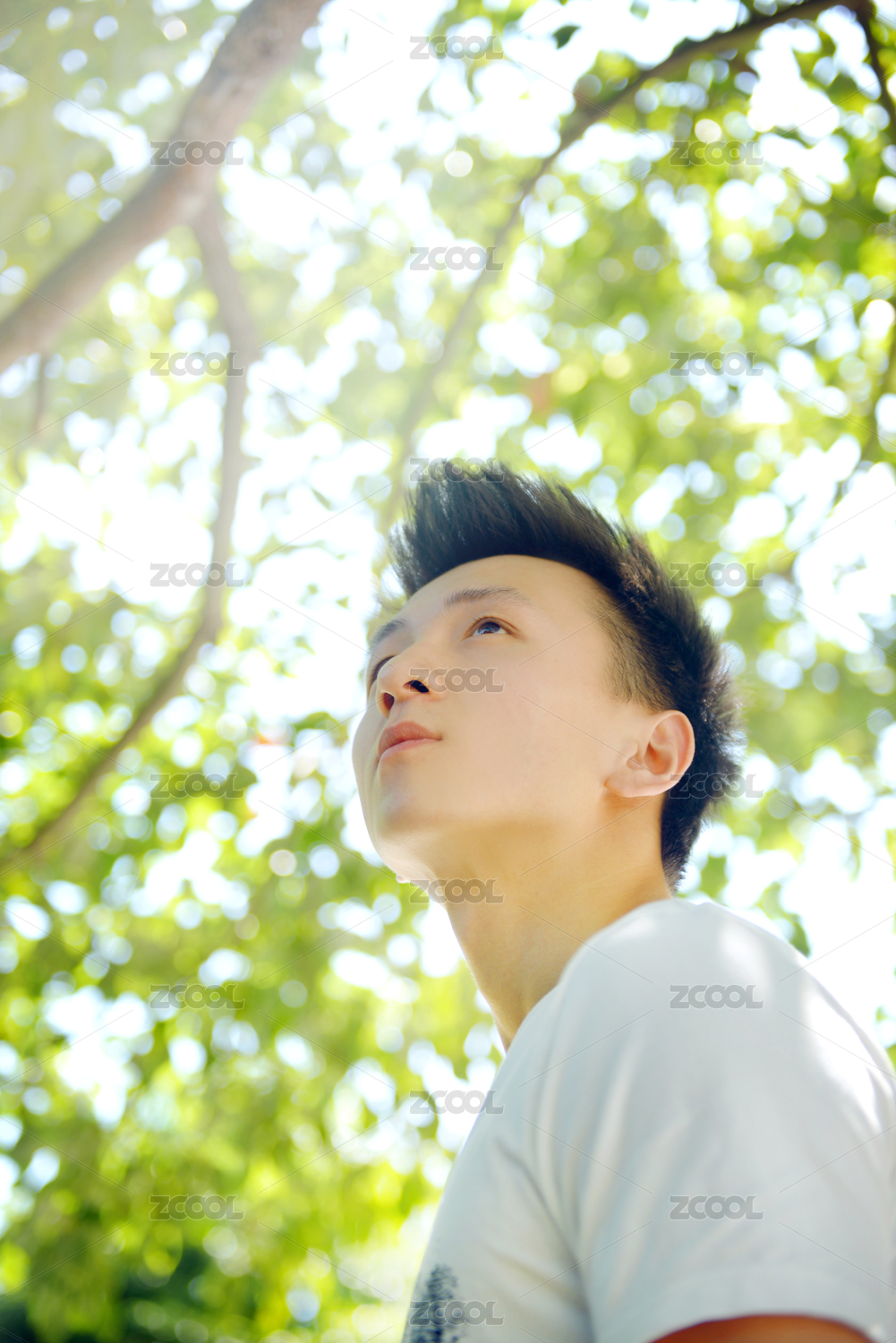 夏天男孩白衣服侧脸微笑低头旅行郊游