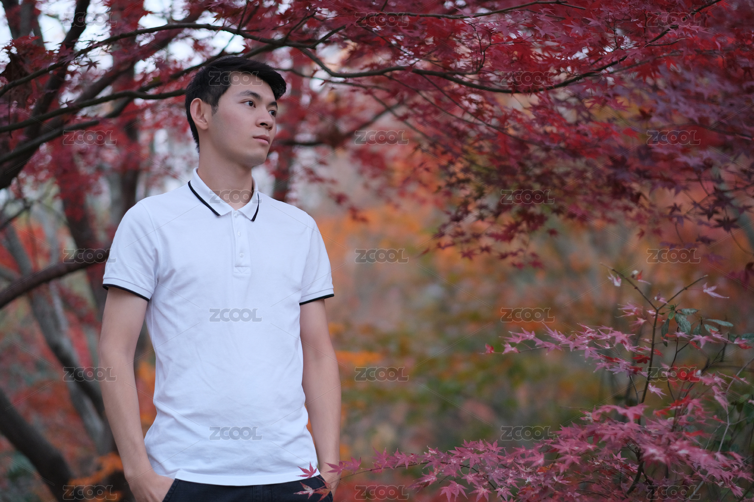 年轻的中国帅哥在秋天户外的公园开心的笑