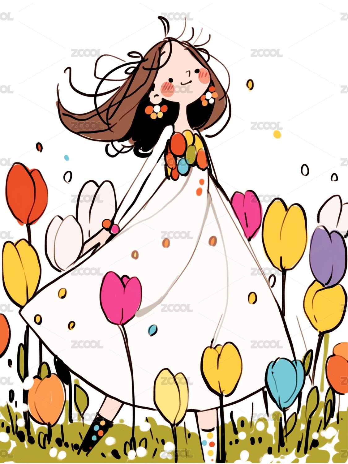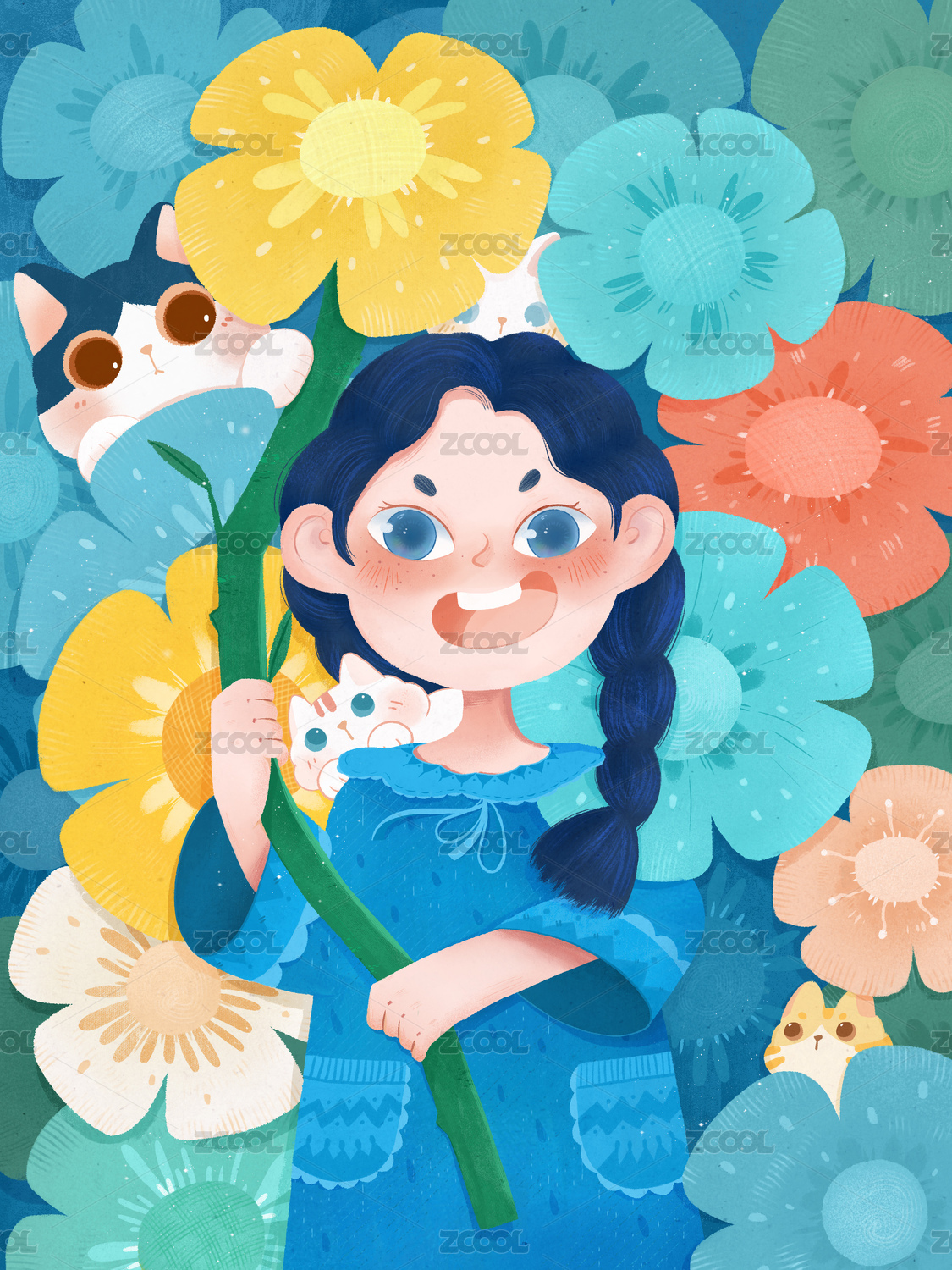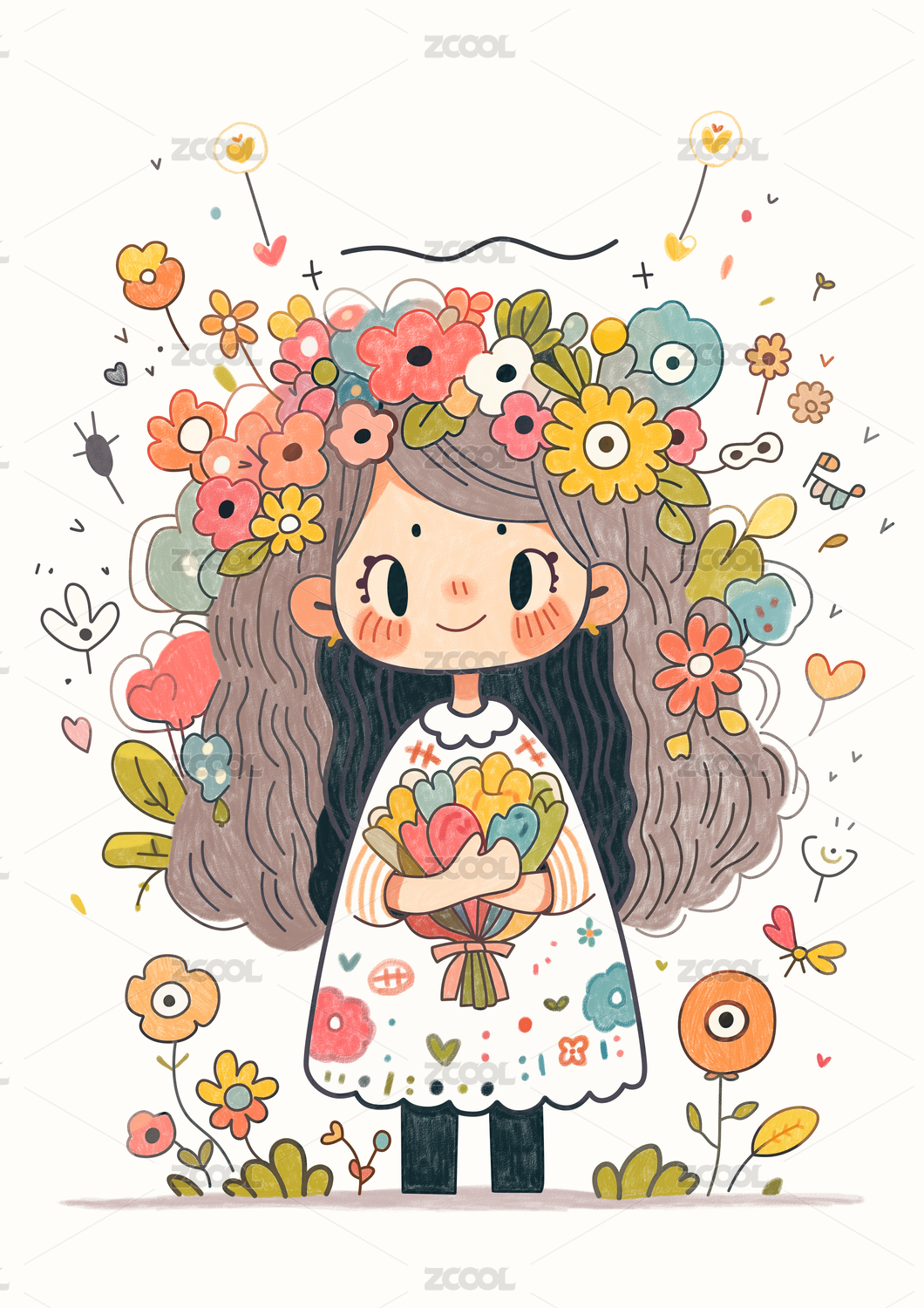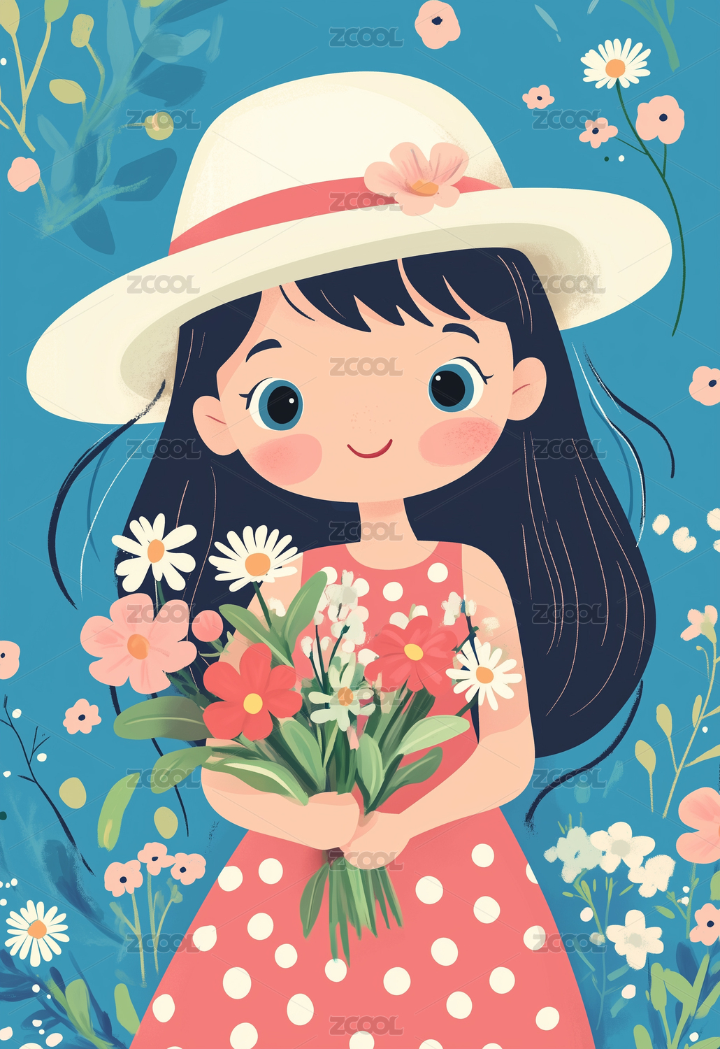 扁平插画彩色花朵女生矢量风格浪漫花束女孩