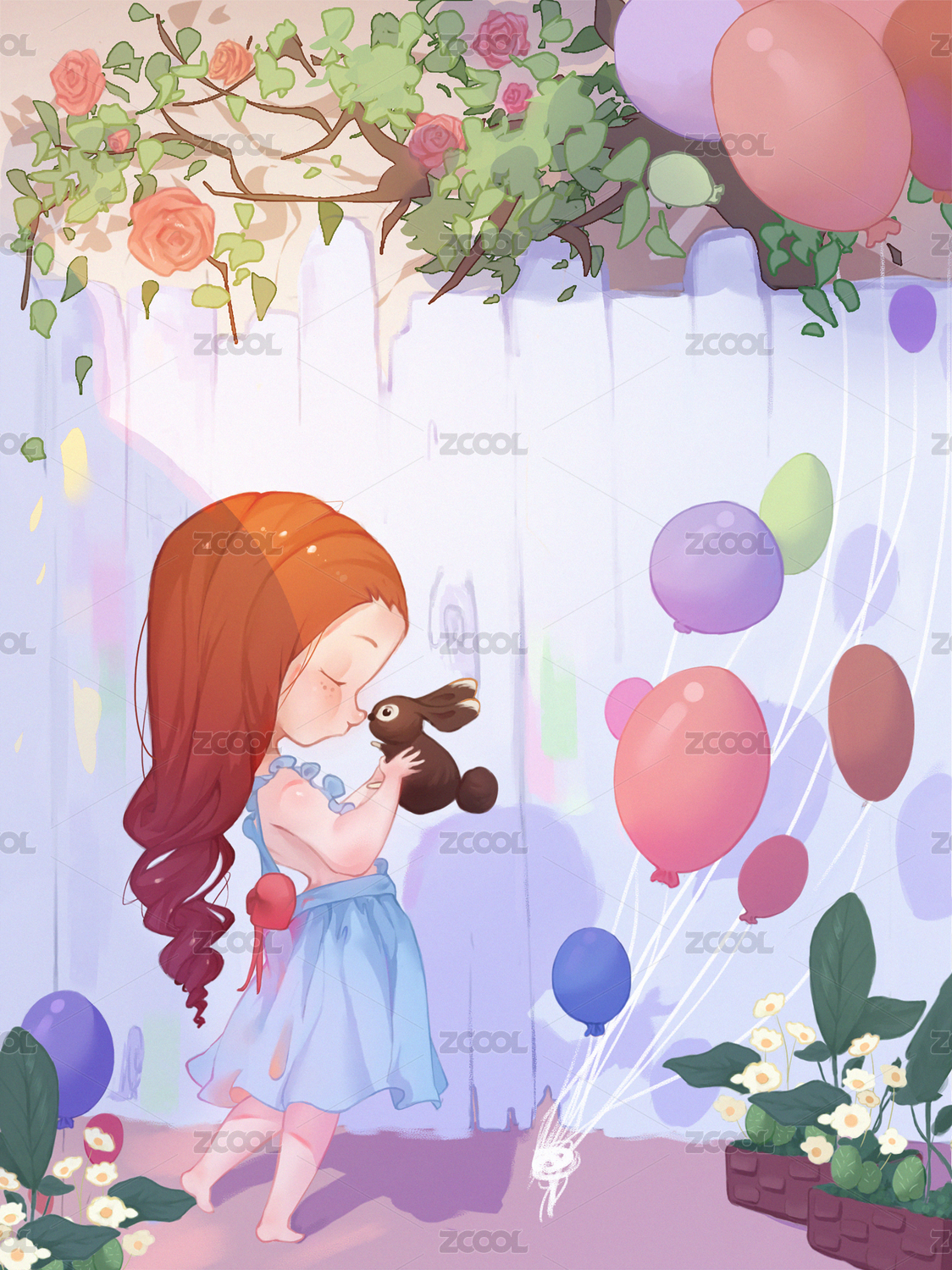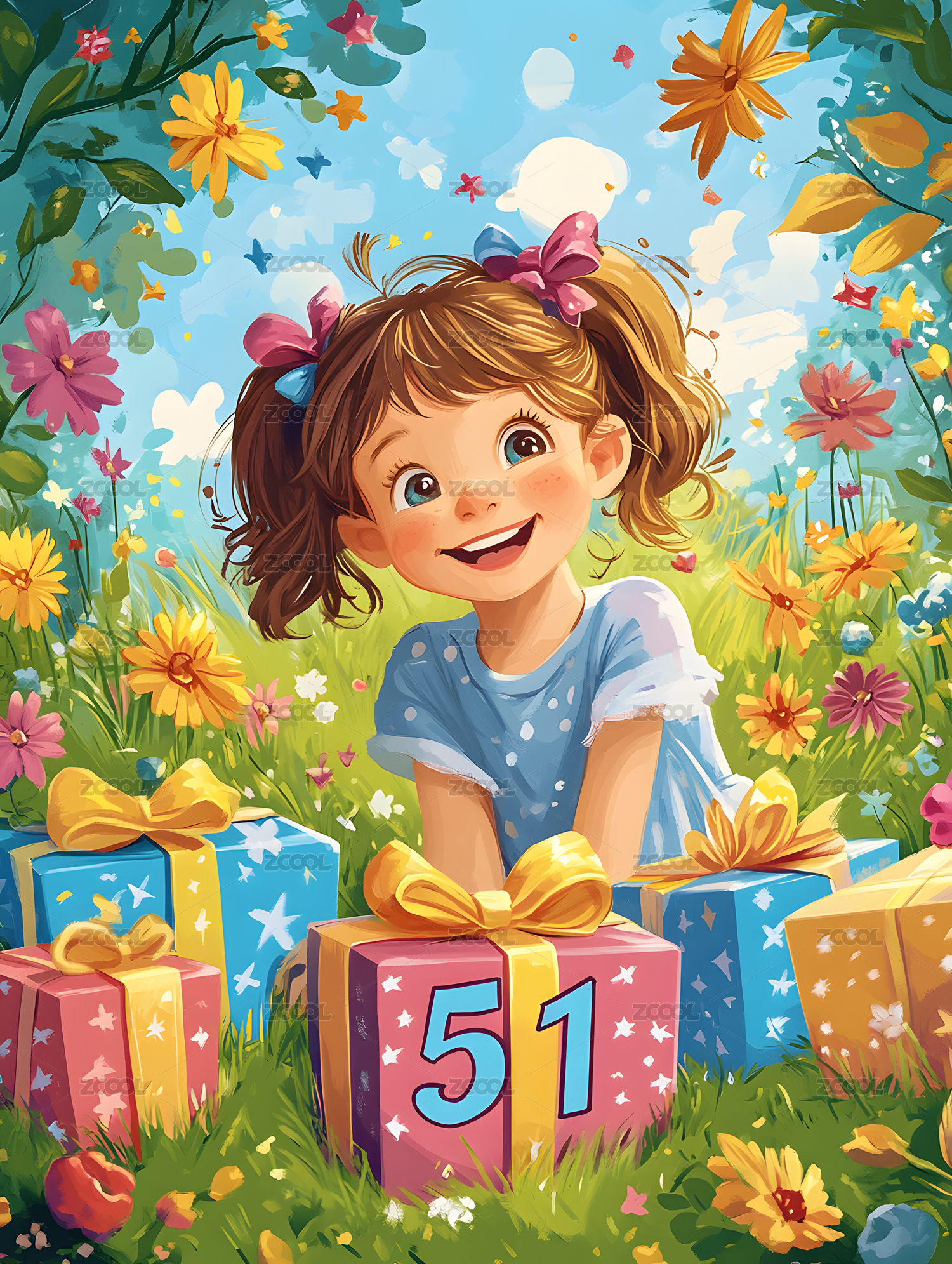 彩虹下头上戴着小花开心笑的卡通小女孩