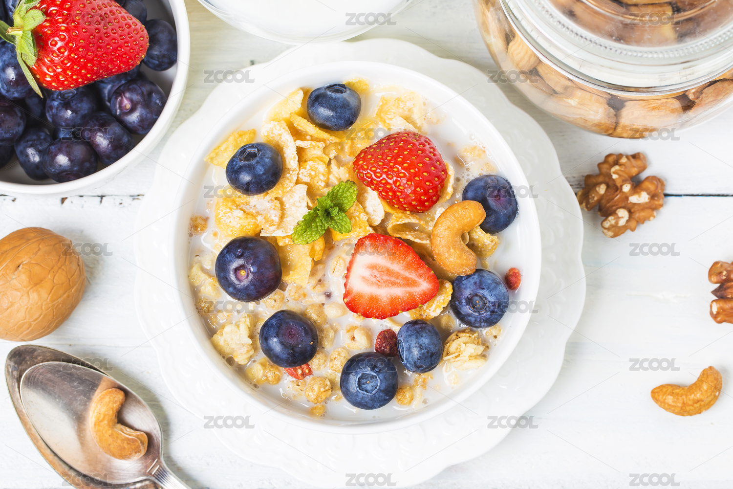 健康营养早餐 新鲜的水果,燕麦片和牛奶