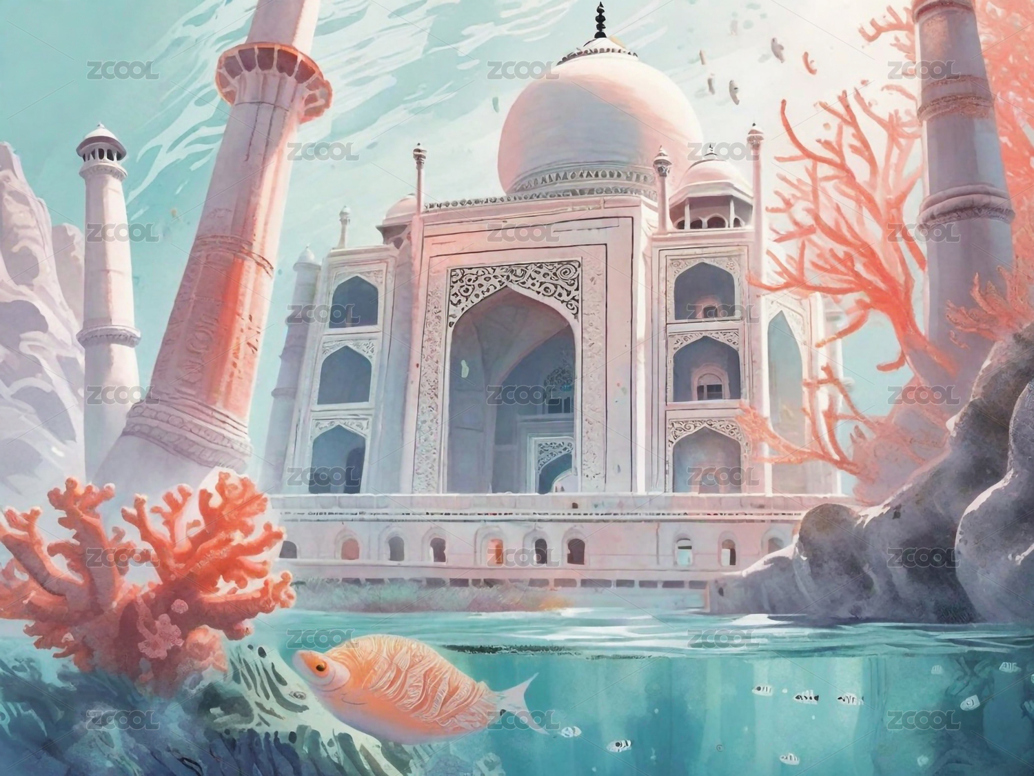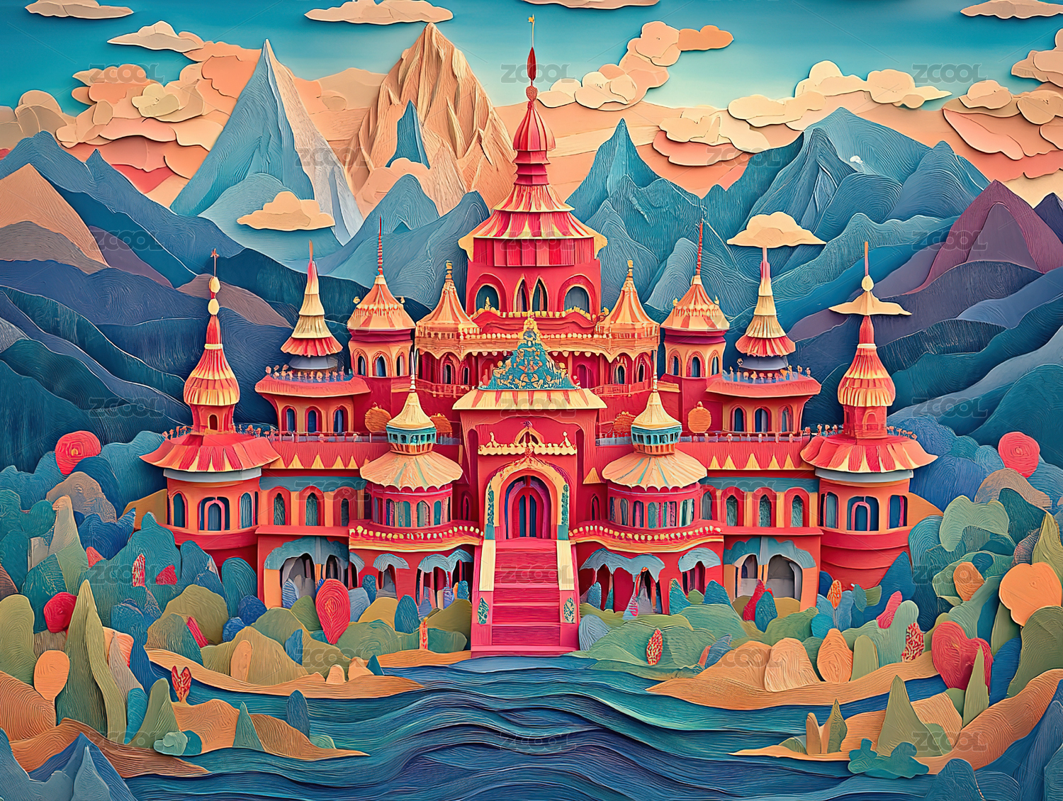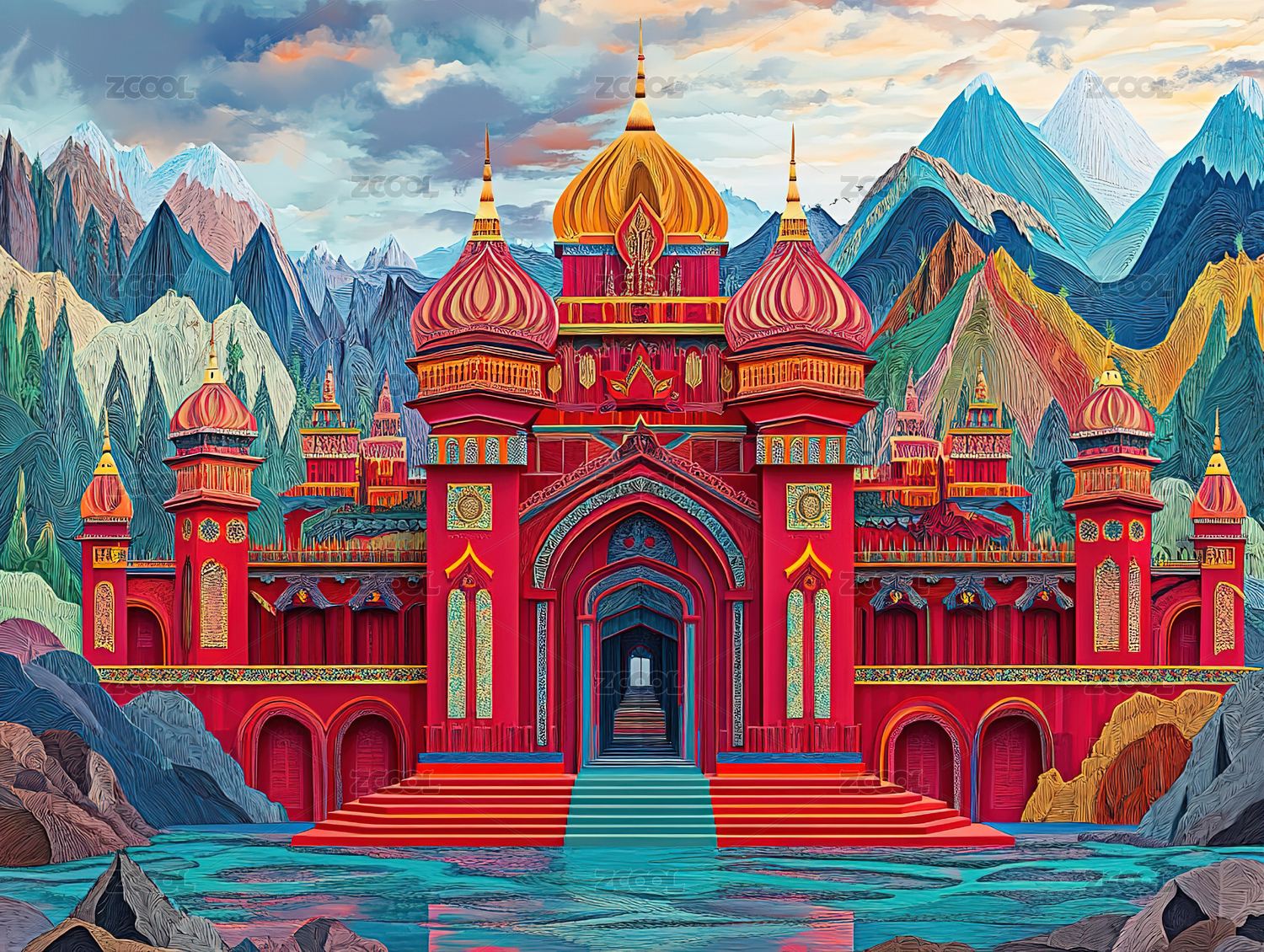 宫殿,云雾缭绕,山峰,层叠的屋檐,宫殿建筑,窗户,门廊,伊斯兰风格,圆顶,尖塔