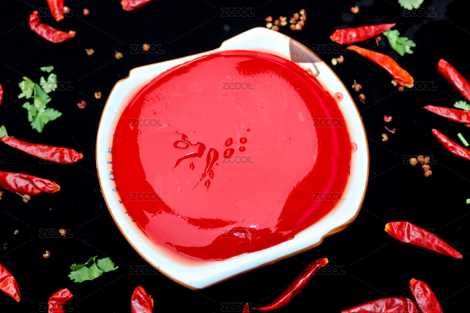 装在黑碟子中的辣椒酱和散落的红辣椒俯拍