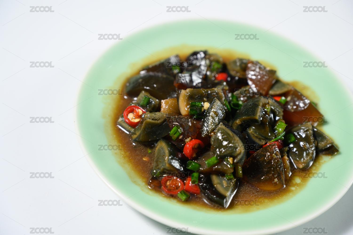 桌面上的盘子里的美味可口的凉拌皮蛋