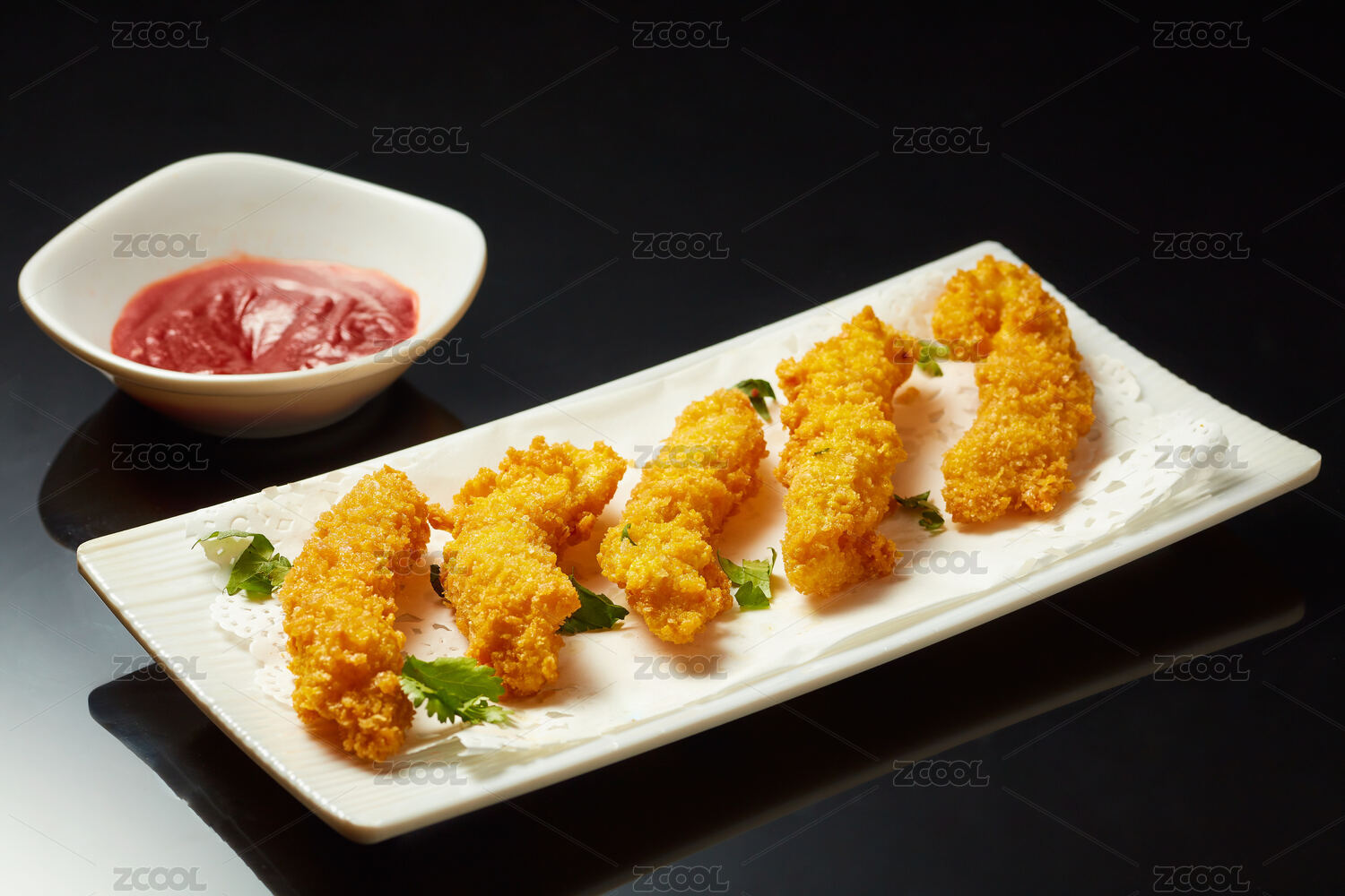 长方盘子里的油炸鸡翅蘸番茄酱