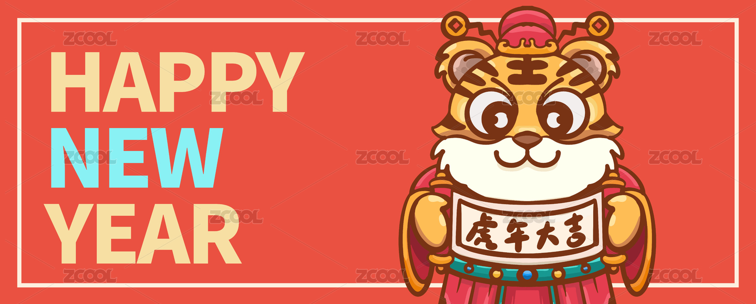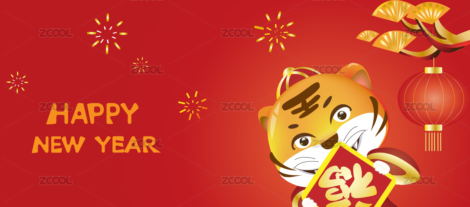 迎新春老虎点鞭炮挑灯笼的新年主题插画