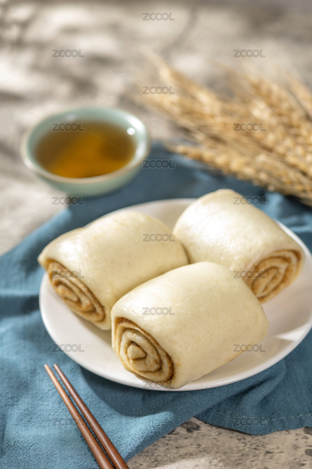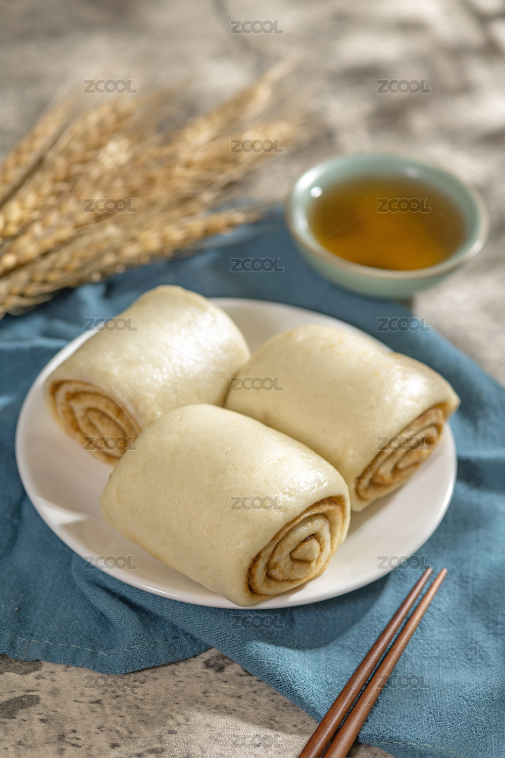 摆放在水泥桌面的传统面食麻酱花卷卷子特写