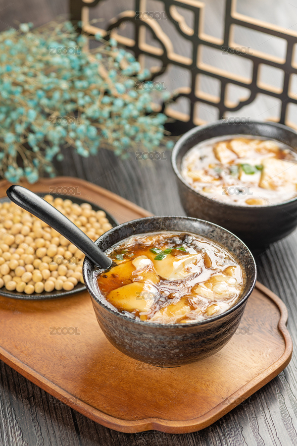 豆腐脑,老豆腐,小吃,早餐,豆腐,木托盘,木桌面,古窗棂