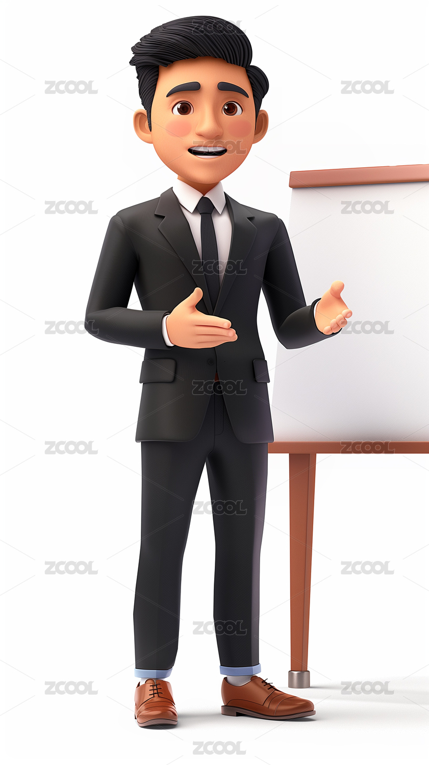西装男职员在白板前汇报演讲的3d卡通站姿