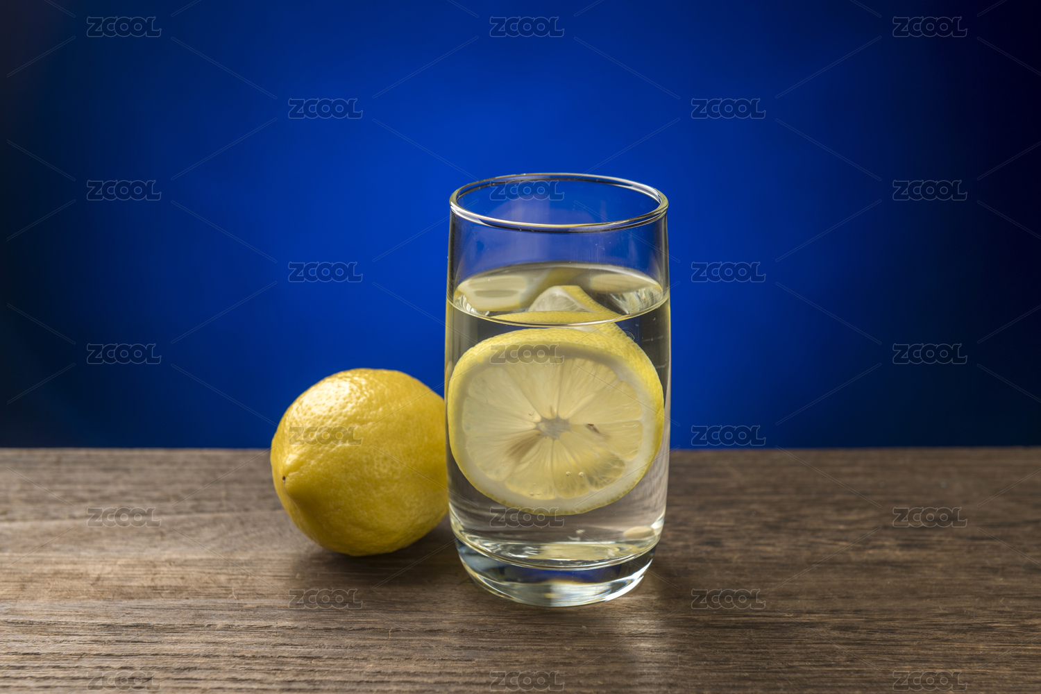 一盘柠檬一杯柠檬水摆放在木桌面上特写