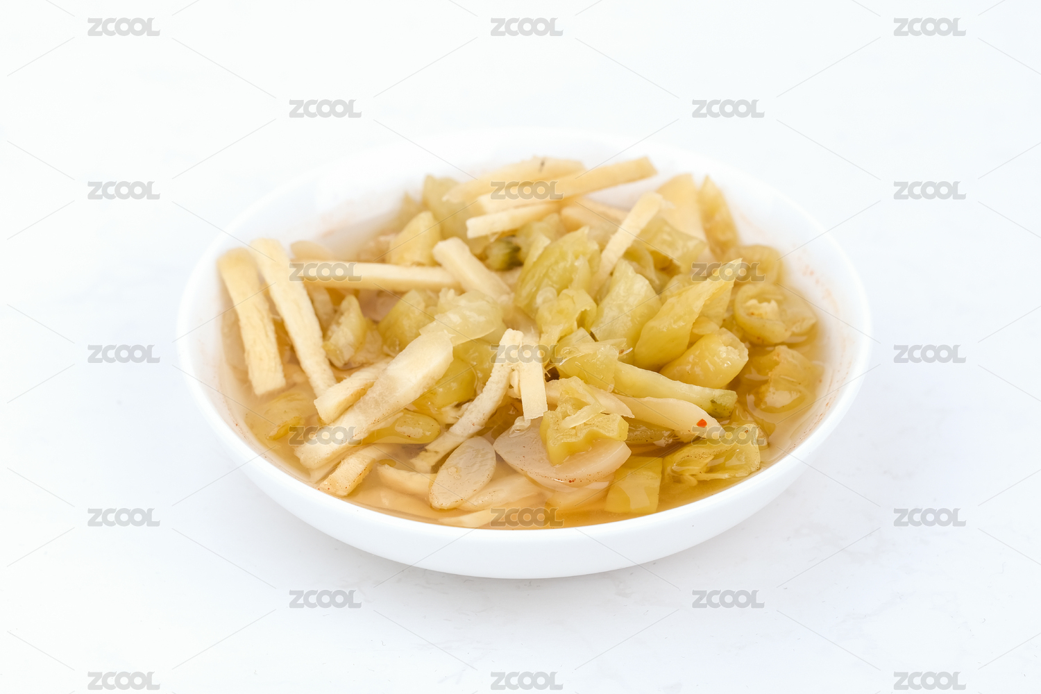 中国美食风味小吃,一大盆酸萝卜在白背景上