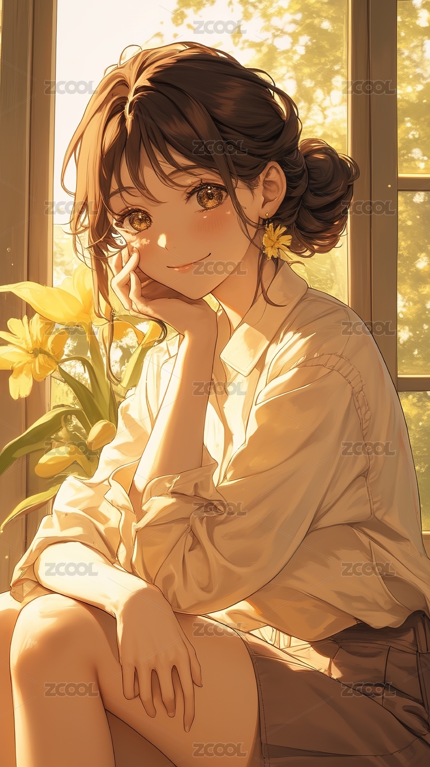 扎着丸子头的少女在窗边拿着花微笑
