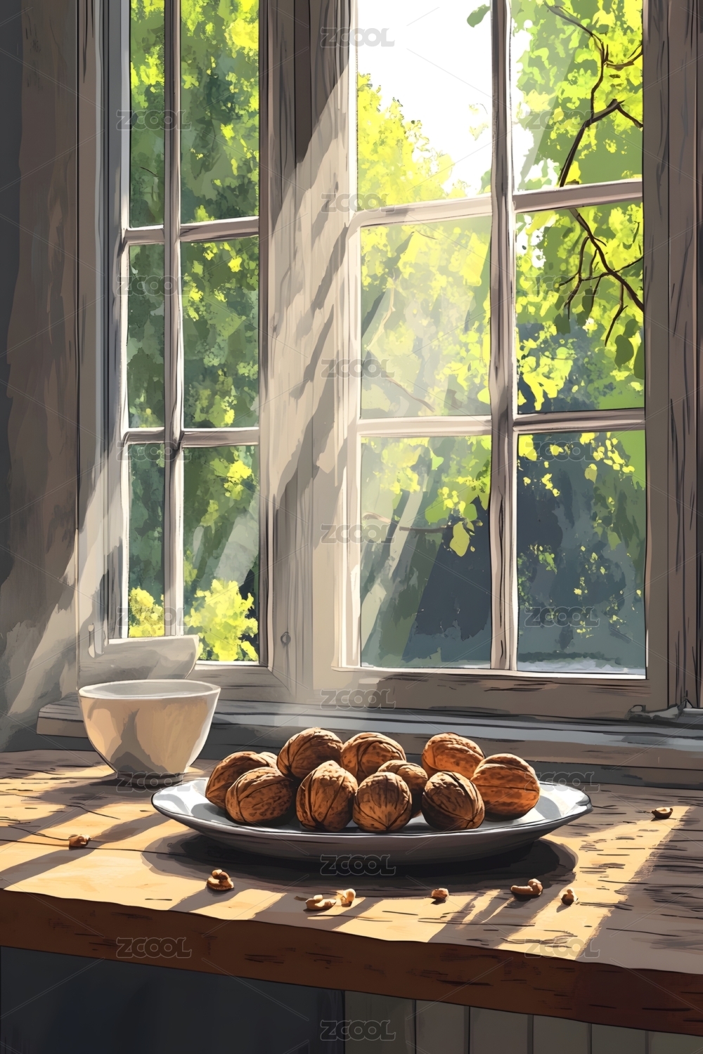 室内咖啡杯植物窗户唯美插画