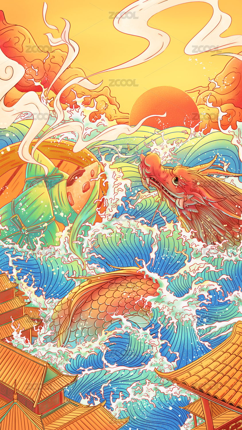 橙红色的龙与年画娃娃在荷塘中嬉戏
