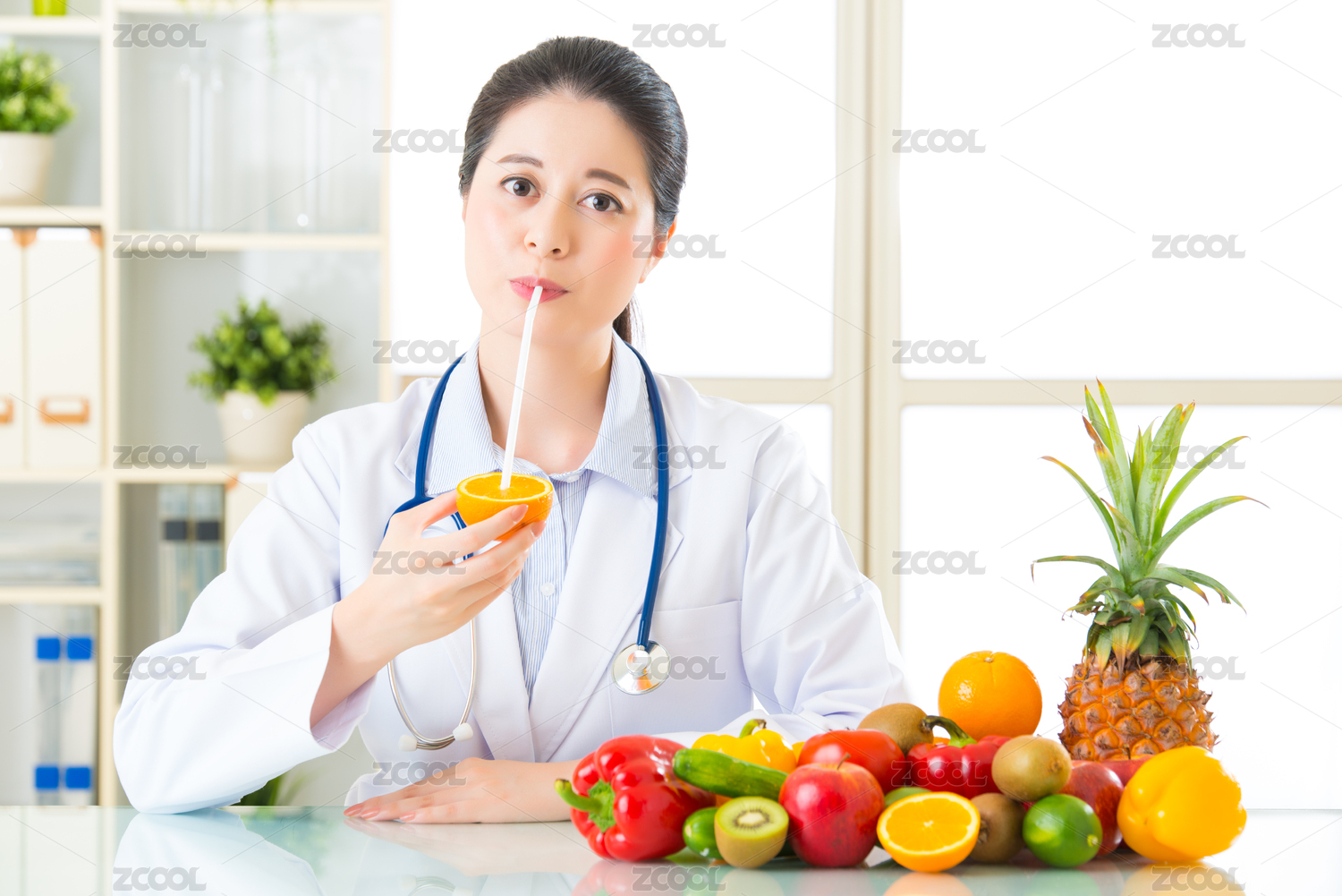 亚洲青年营养师饮用橙汁,健康饮食