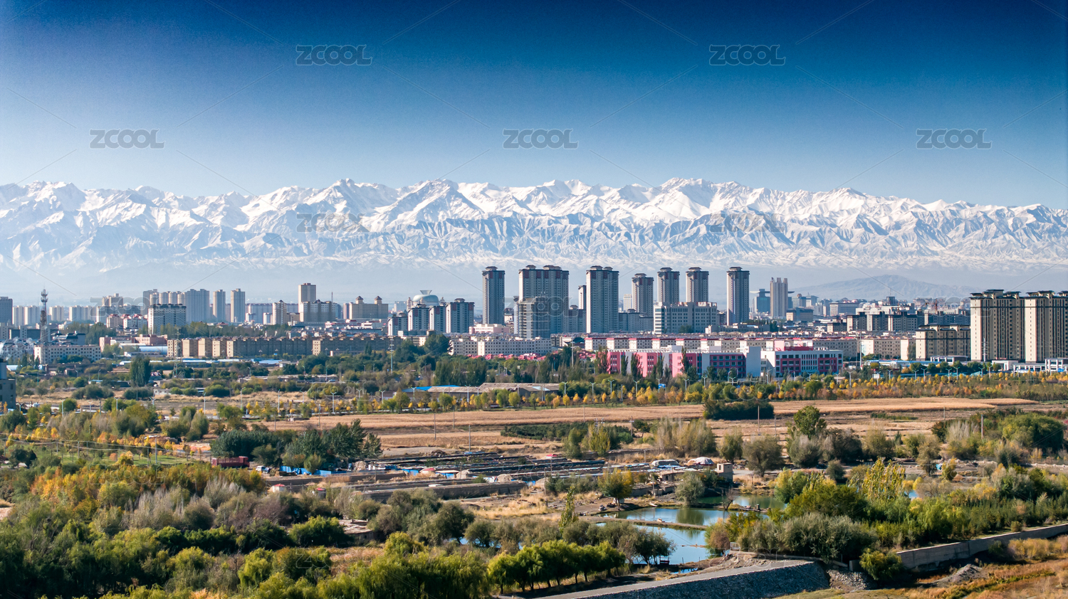 中国新疆阿克苏市的高楼沐浴在夕阳里