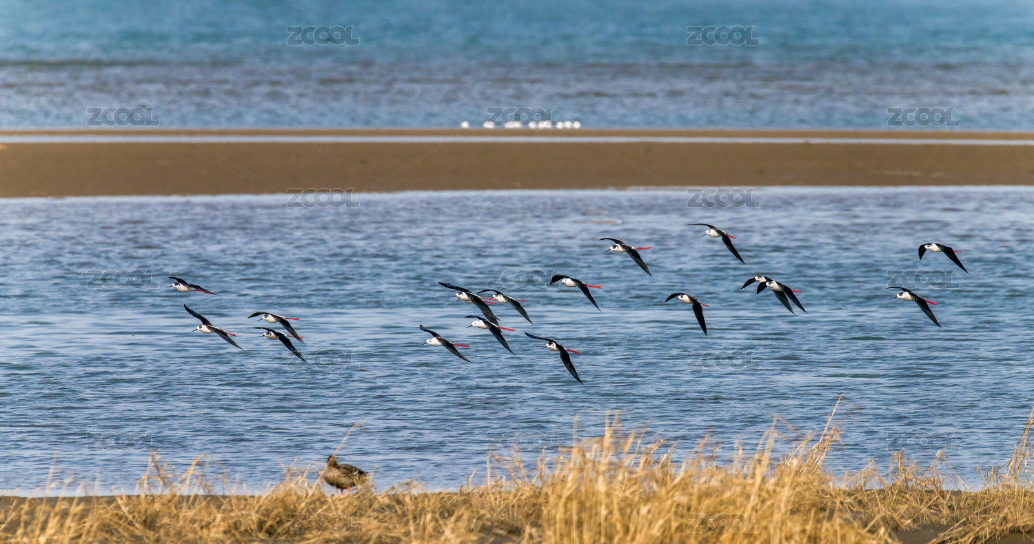 中国河北省秦皇岛市北戴河湿地黑翅长腿鹬群