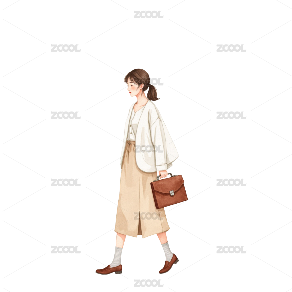 手拿鲜花和包的女孩穿着绿色针织衫深色裙子