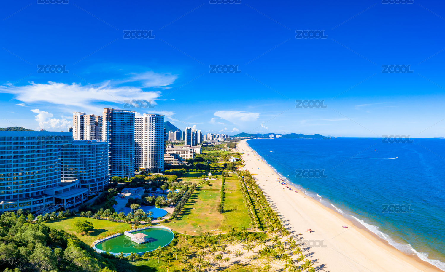 航拍中国海南三亚湾旅游度假区海水浴场椰林沙滩
