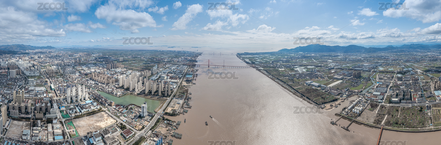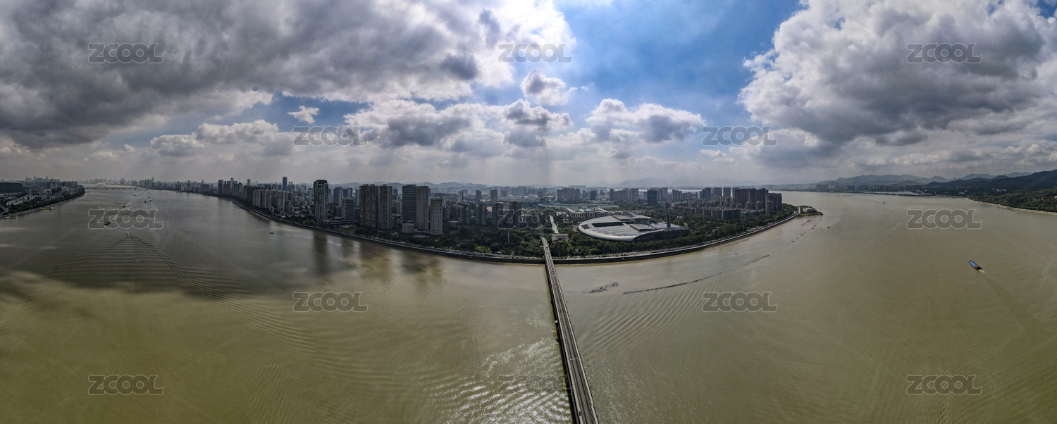 中国浙江杭州钱塘江风光全景图航拍