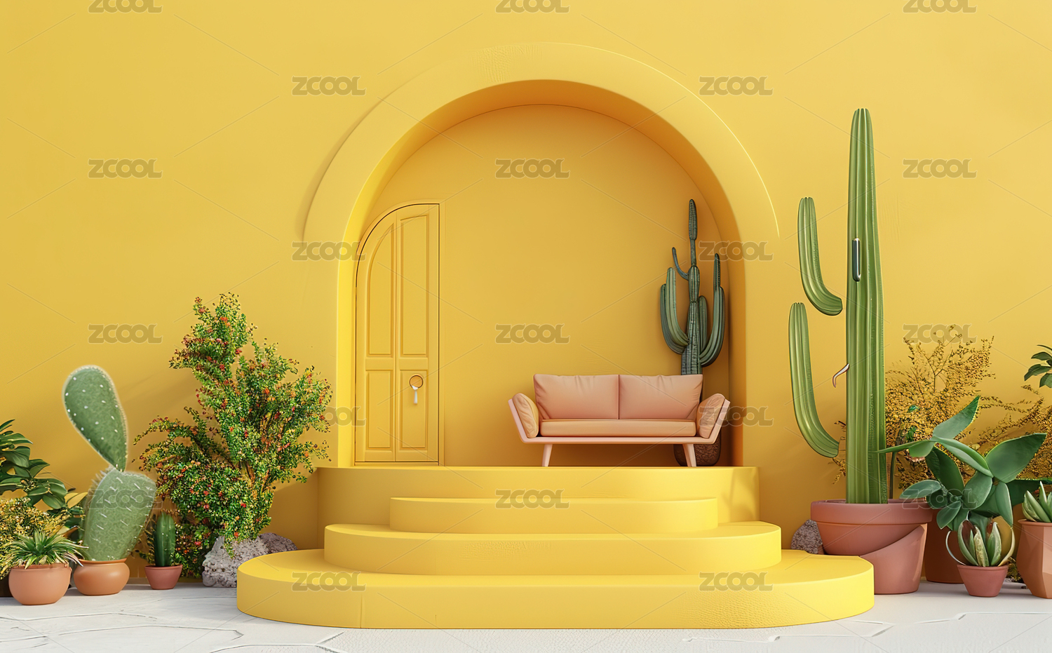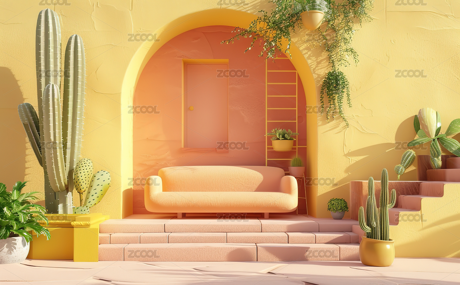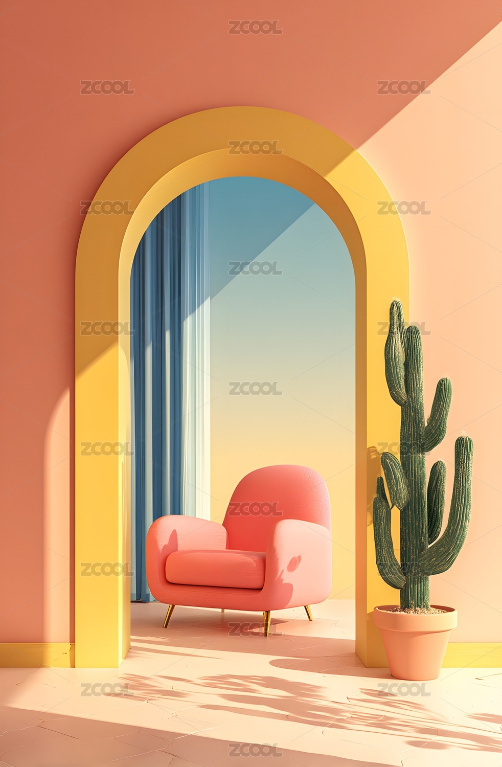 粉色沙发与仙人掌 简约拱门下的温馨氛围