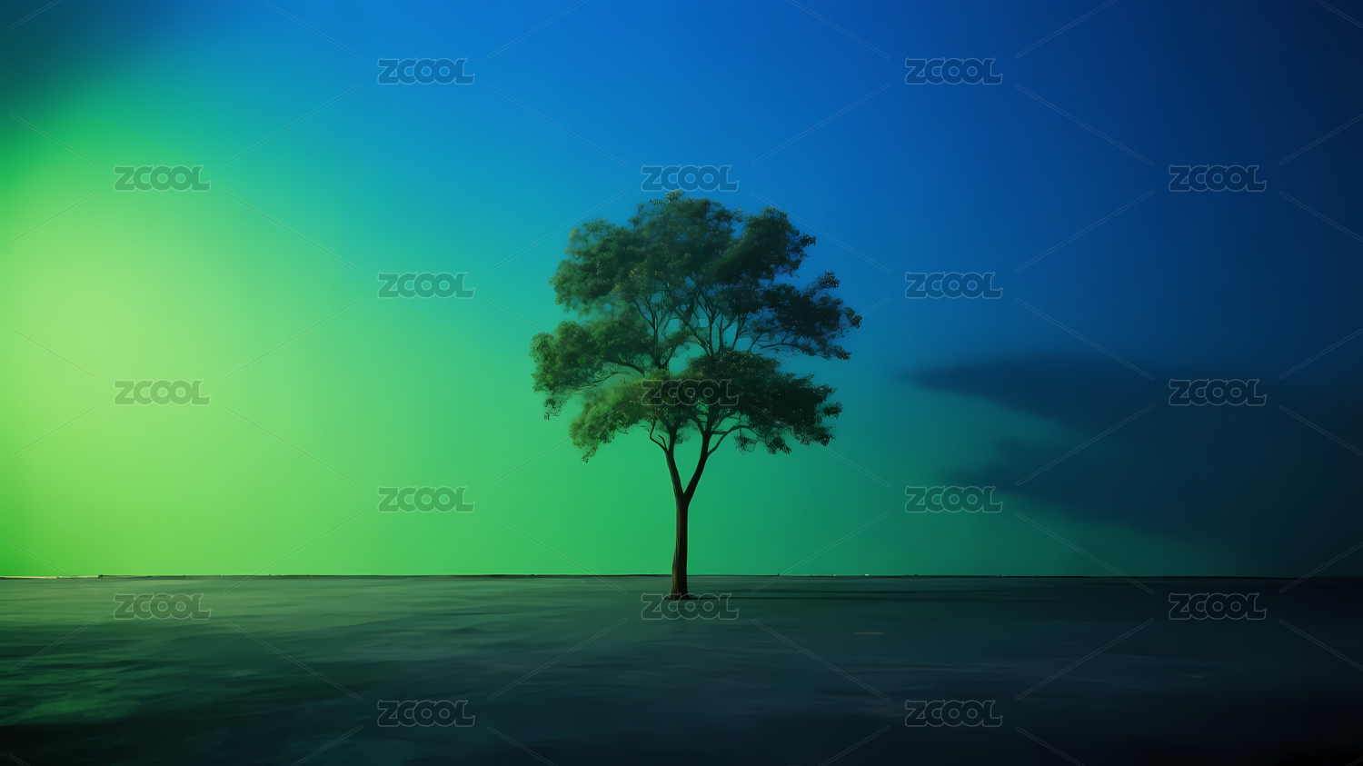夕阳下田野上光秃秃的树在天空的映衬下剪影