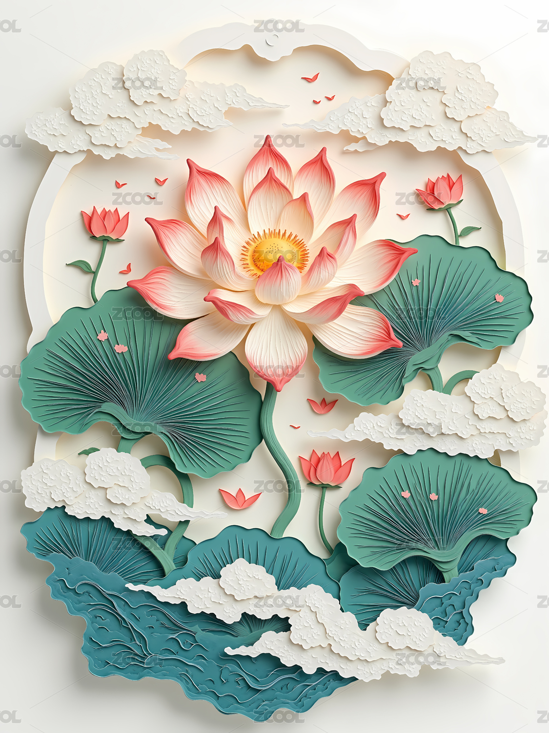 剪纸风荷花插画