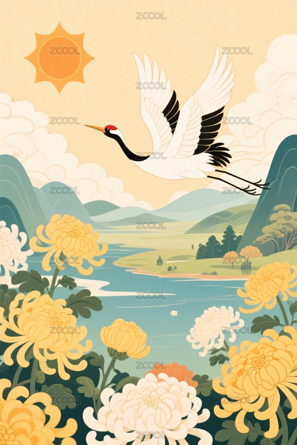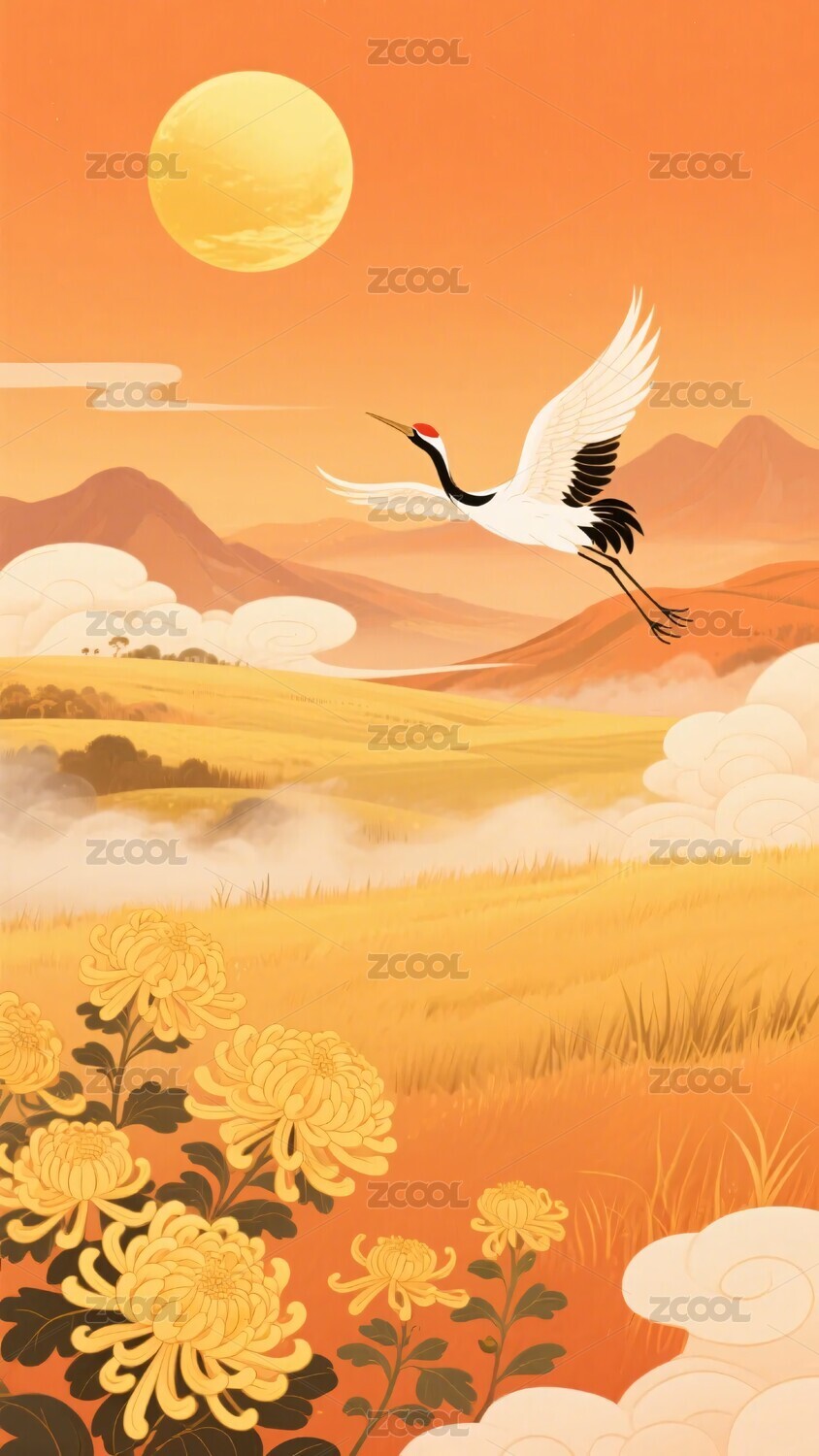 秋日飞鹤与菊花美景插画