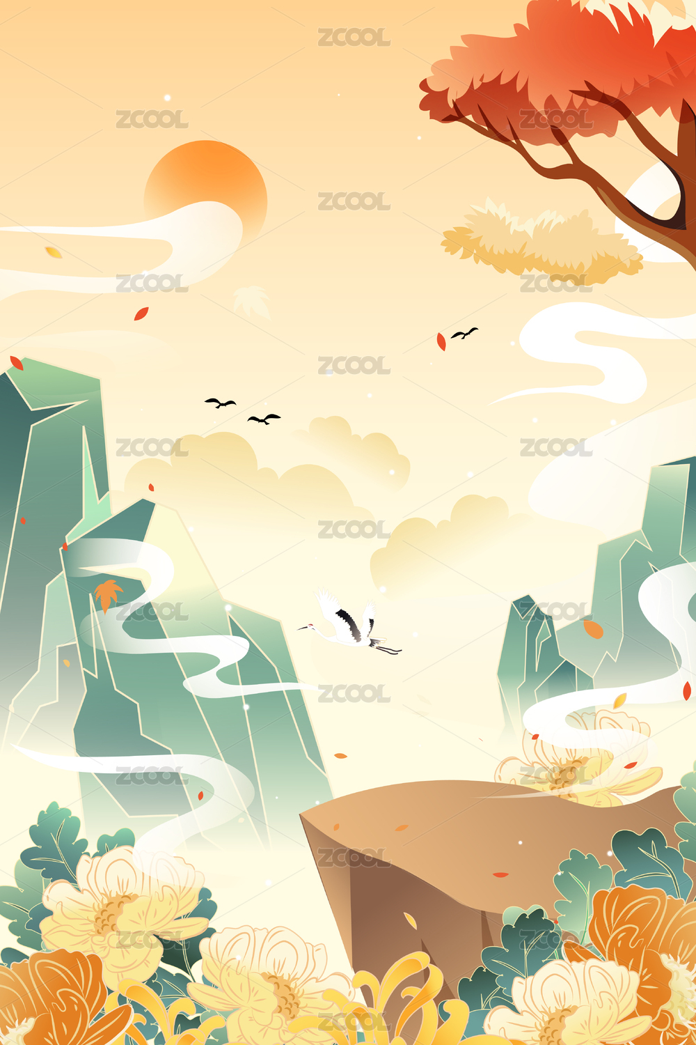 重阳节菊花仙鹤插画