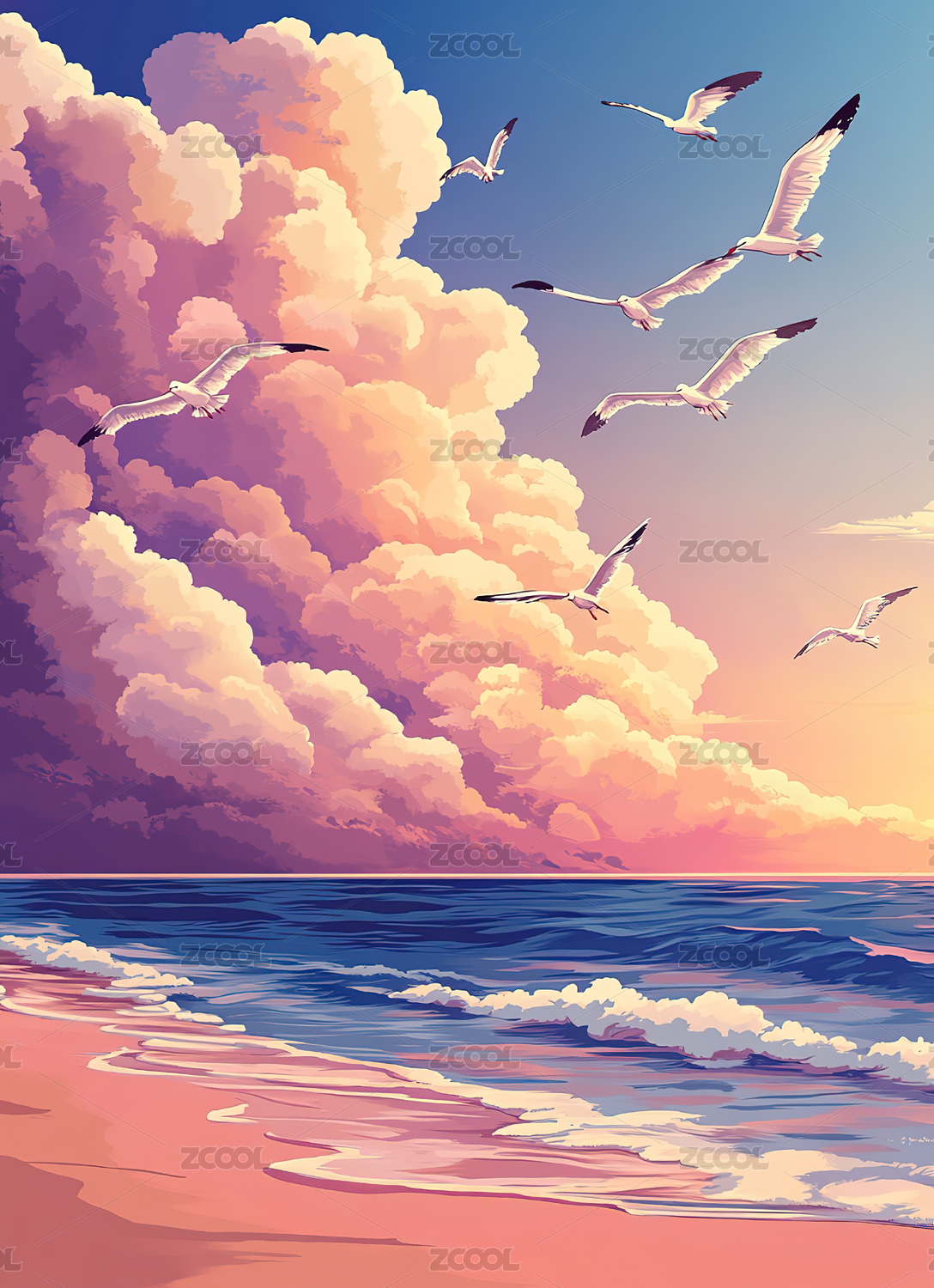 海边沙滩风景扁平风格插画背景壁纸