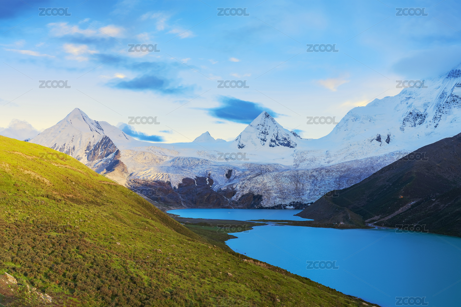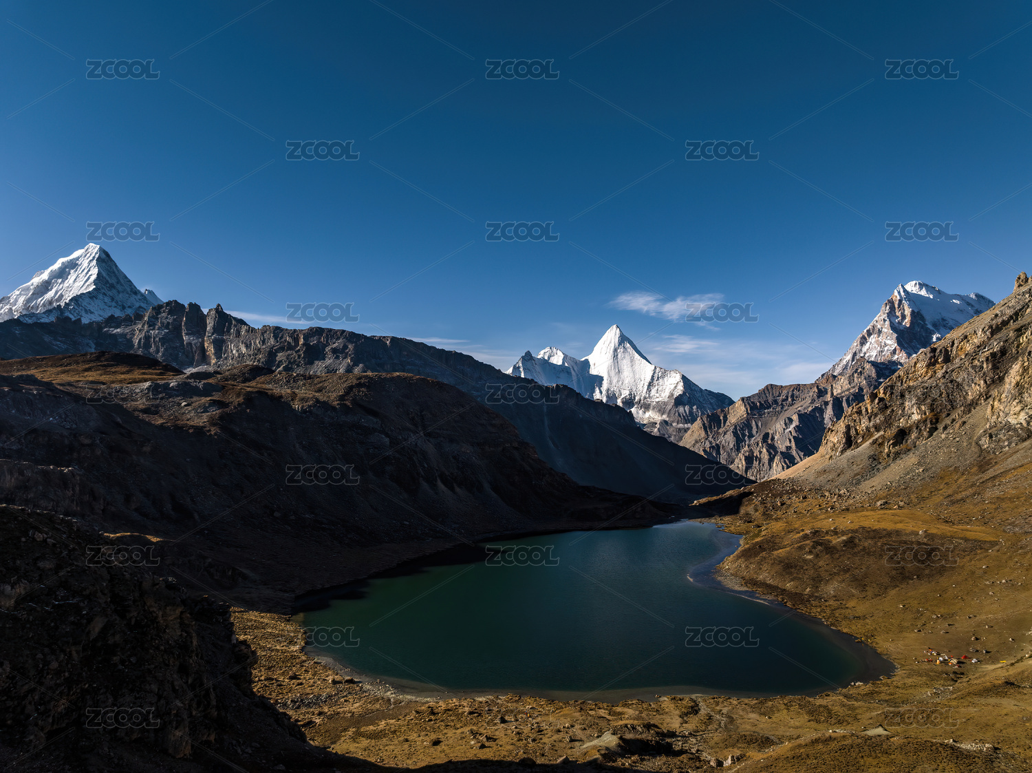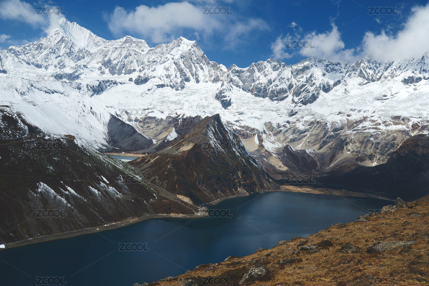 中国西藏山南市洛扎县贡嘎错和周围的雪山