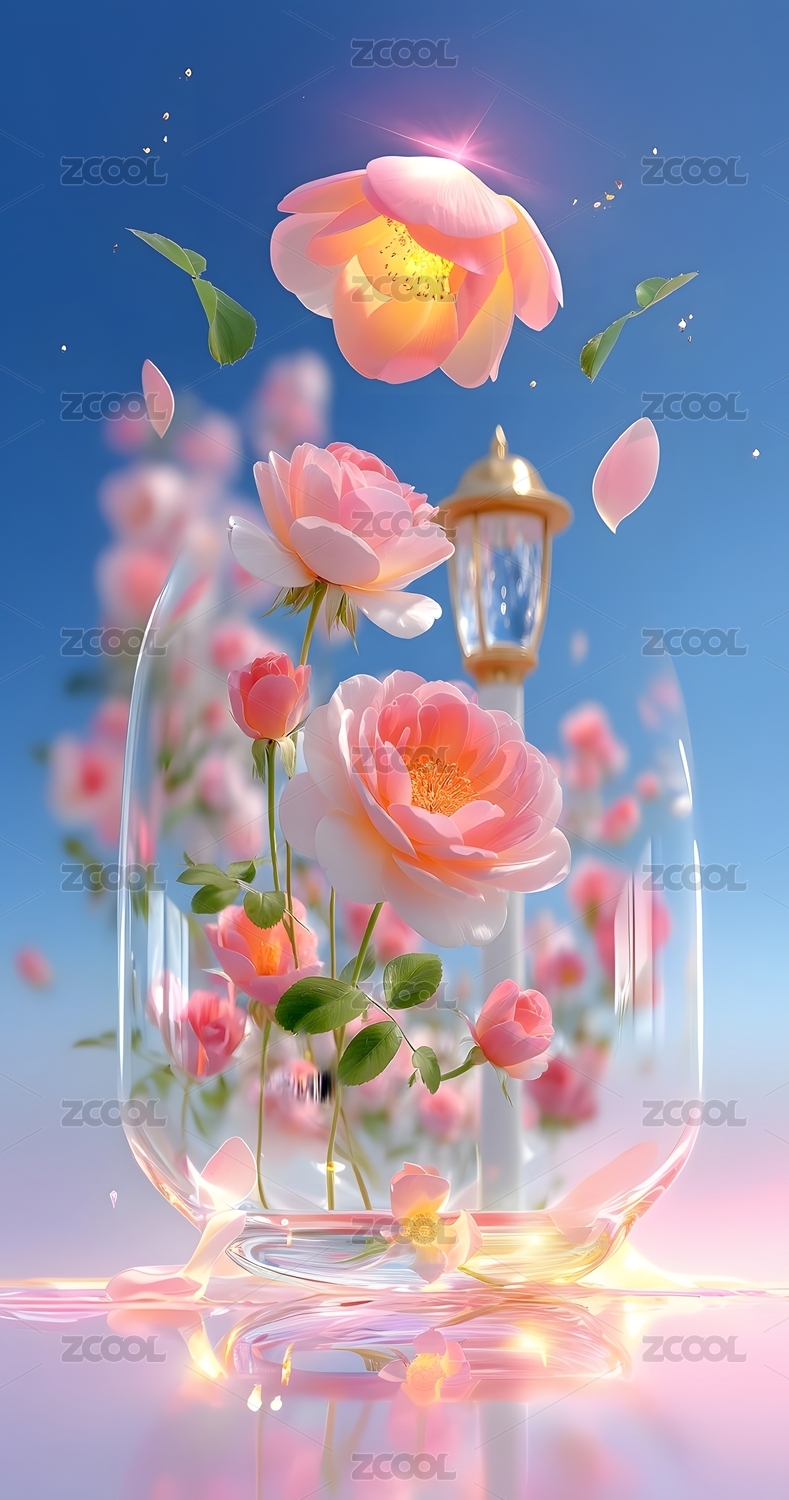 白底抽象玻璃粉色透明花卉植物3D立体插画