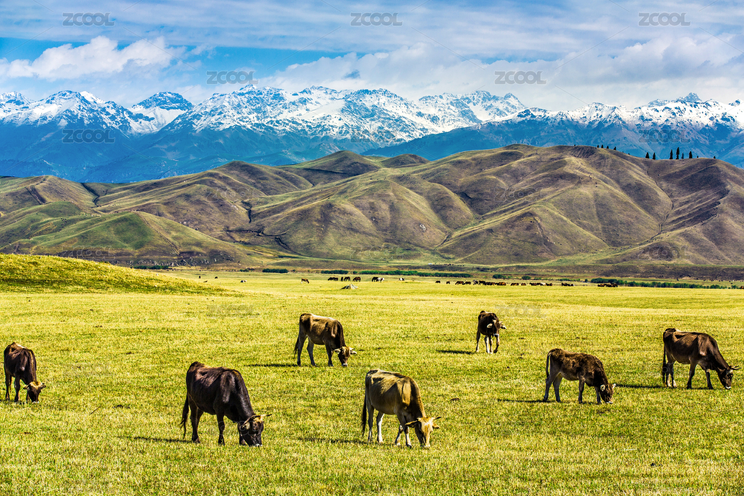 中国新疆连绵雪山下的牧场,牛羊在吃草