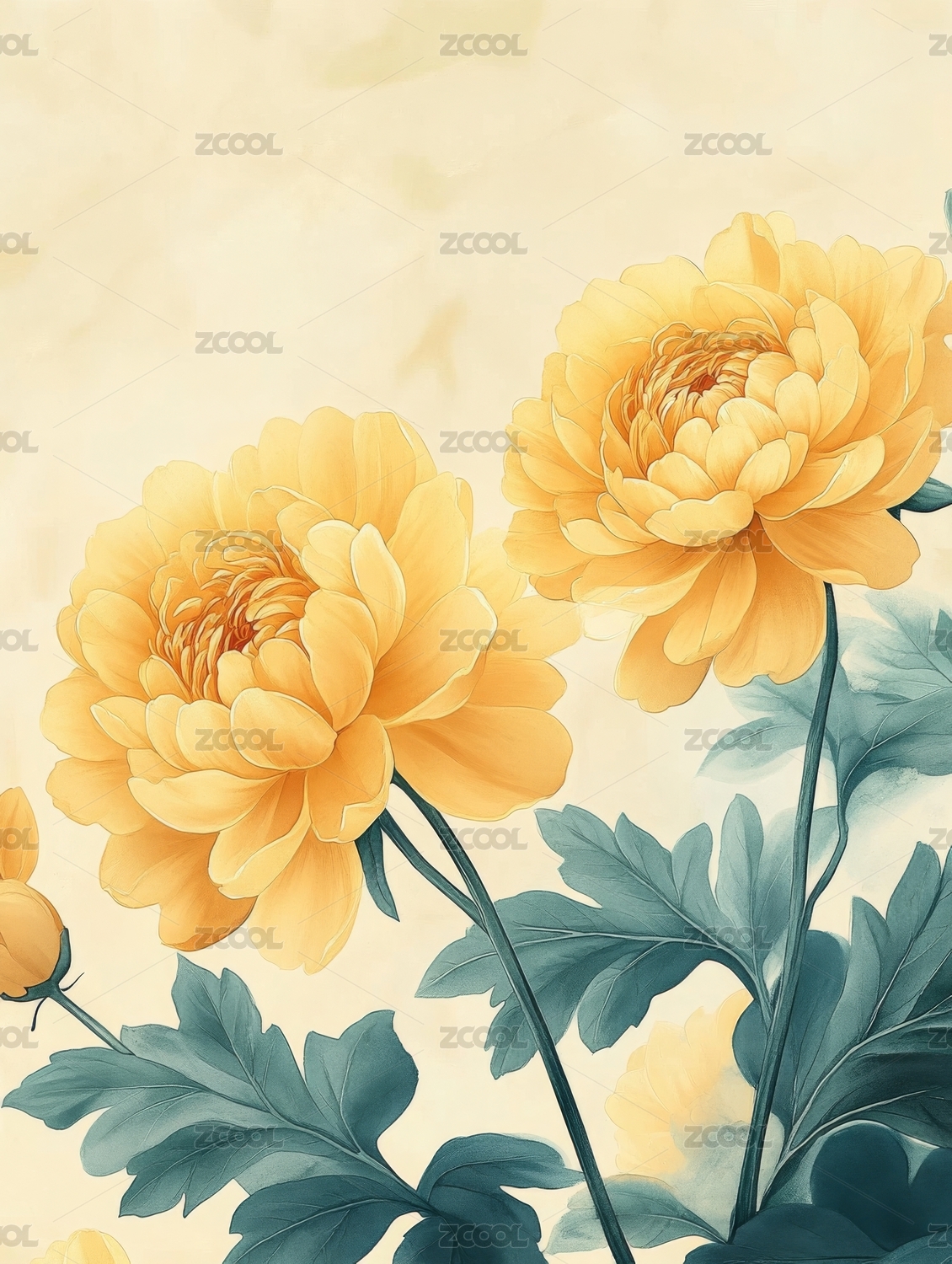水彩风,菊花,金菊,黄菊,秋菊,花卉,花枝,插画