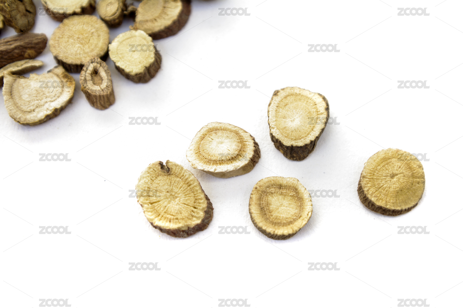 白色背景上的中药材甘草片