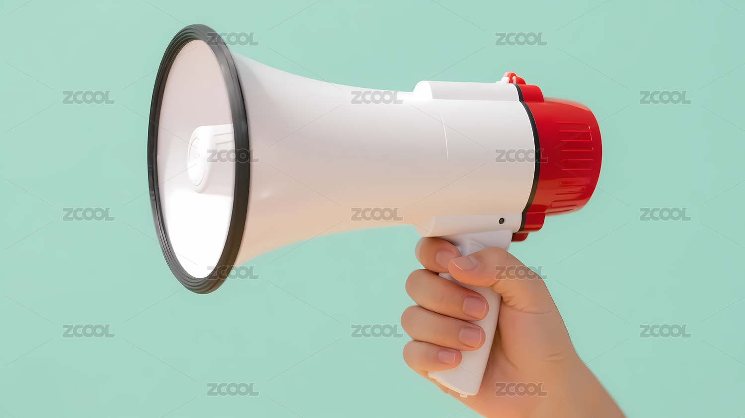 公告的概念。 喊出来。 手拿着扩音机在白色背景上。