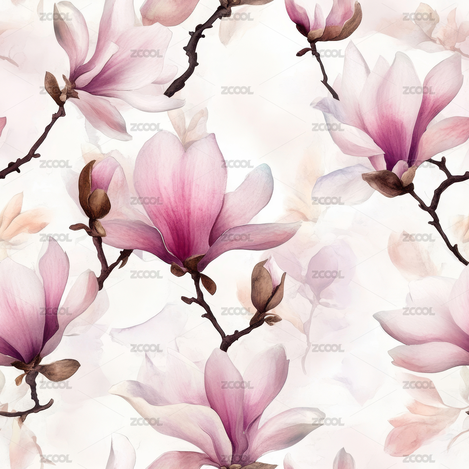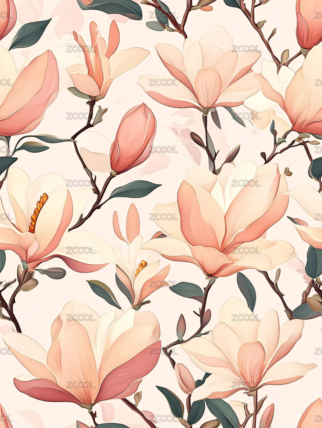 清新典雅带枝条的玉兰四方连续无缝拼接背景