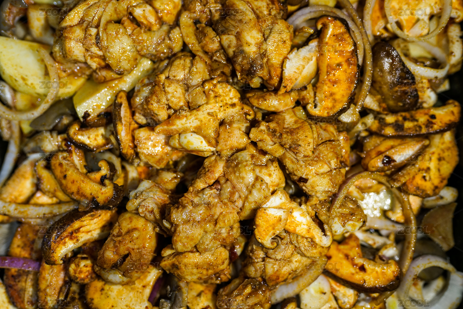 新鲜食材特写五彩缤纷蘑菇片肉丝