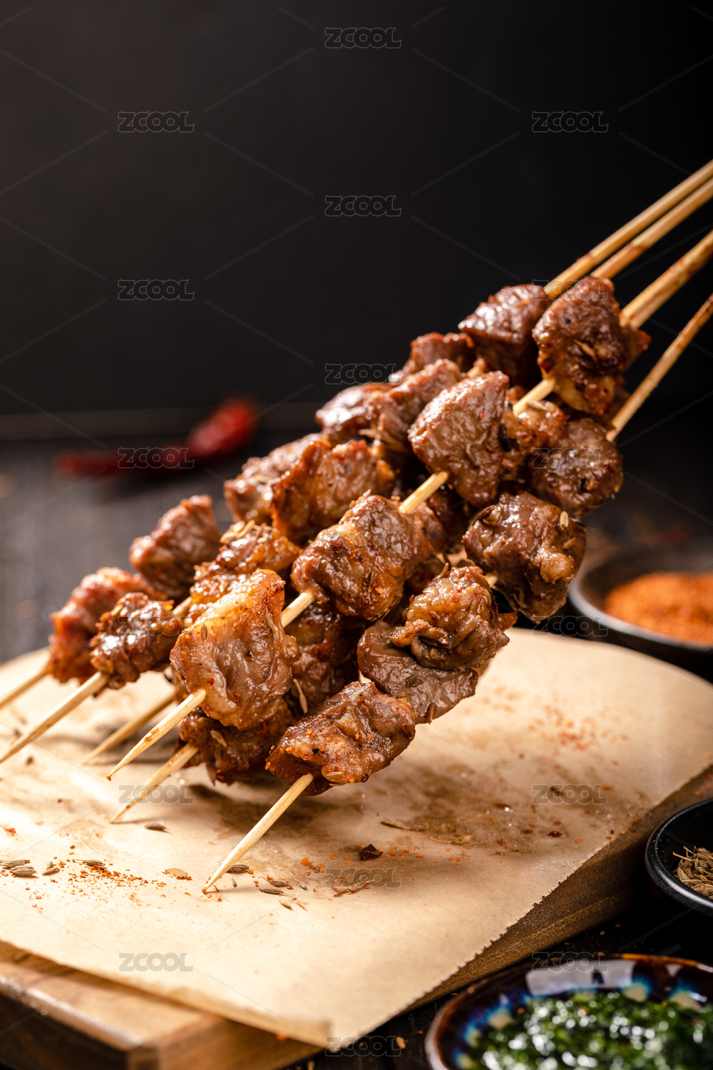 暗背景砧板水上多串放一起的烤肉羊肉串