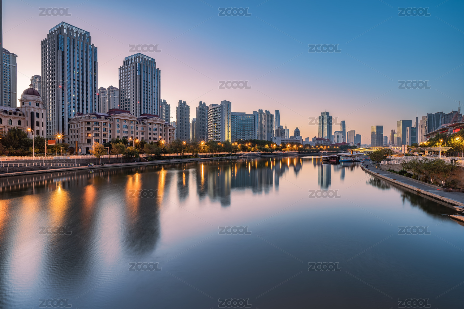 中国天津海河的水路交通和现代建筑及桥梁天际线