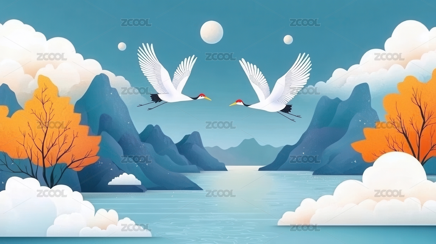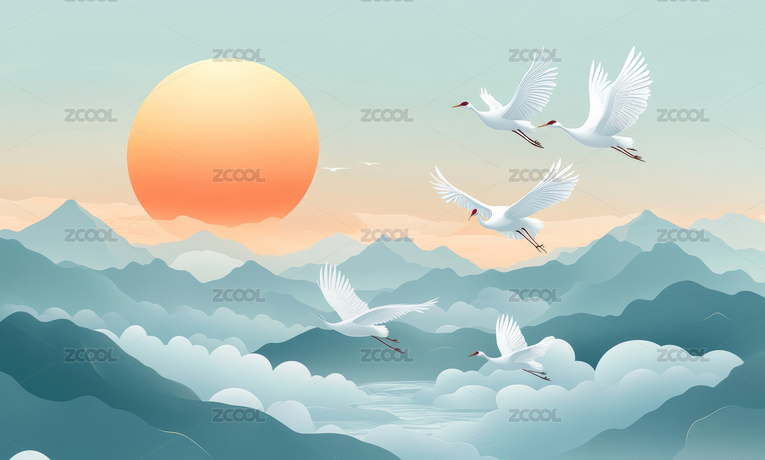 中国风仙鹤祥云山峦插画背景