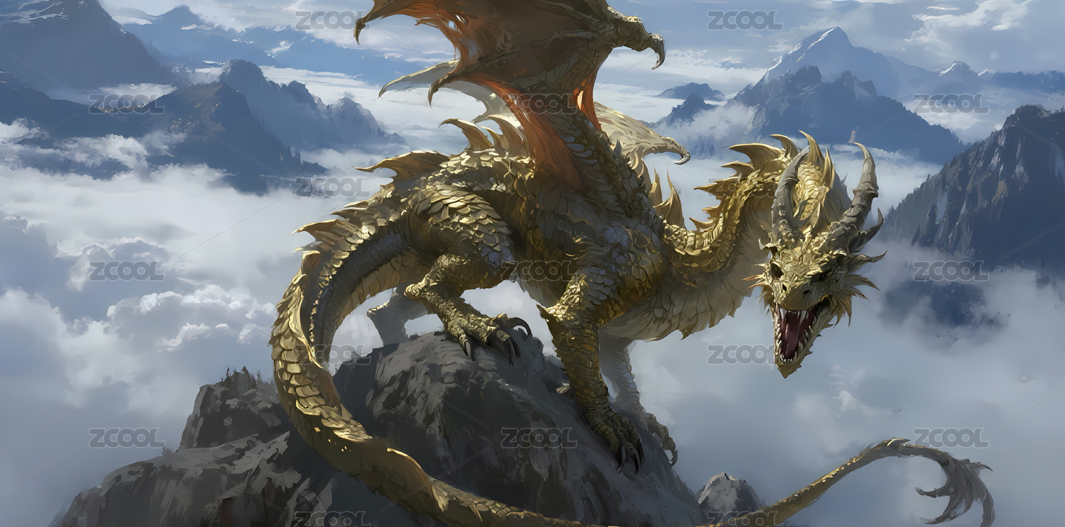 金色巨龙翱翔于云雾缭绕的山峰间