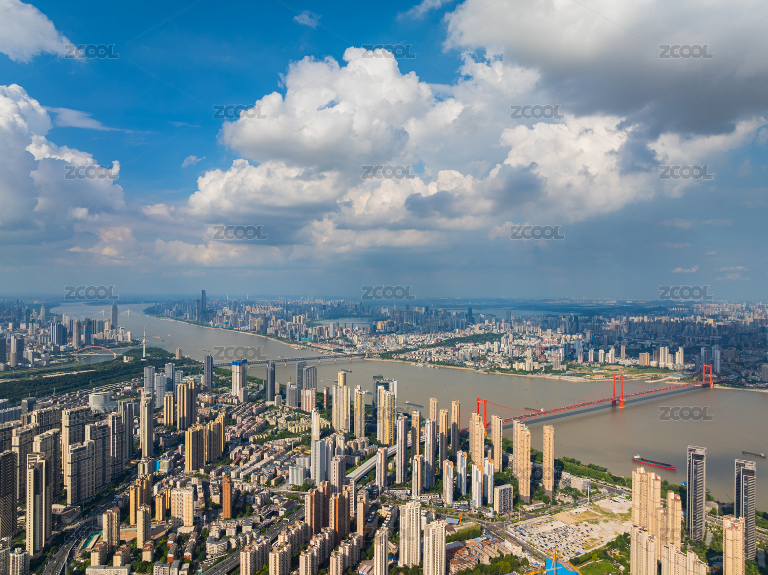 航拍夏季白天武汉长江上的桥梁和城市天际线