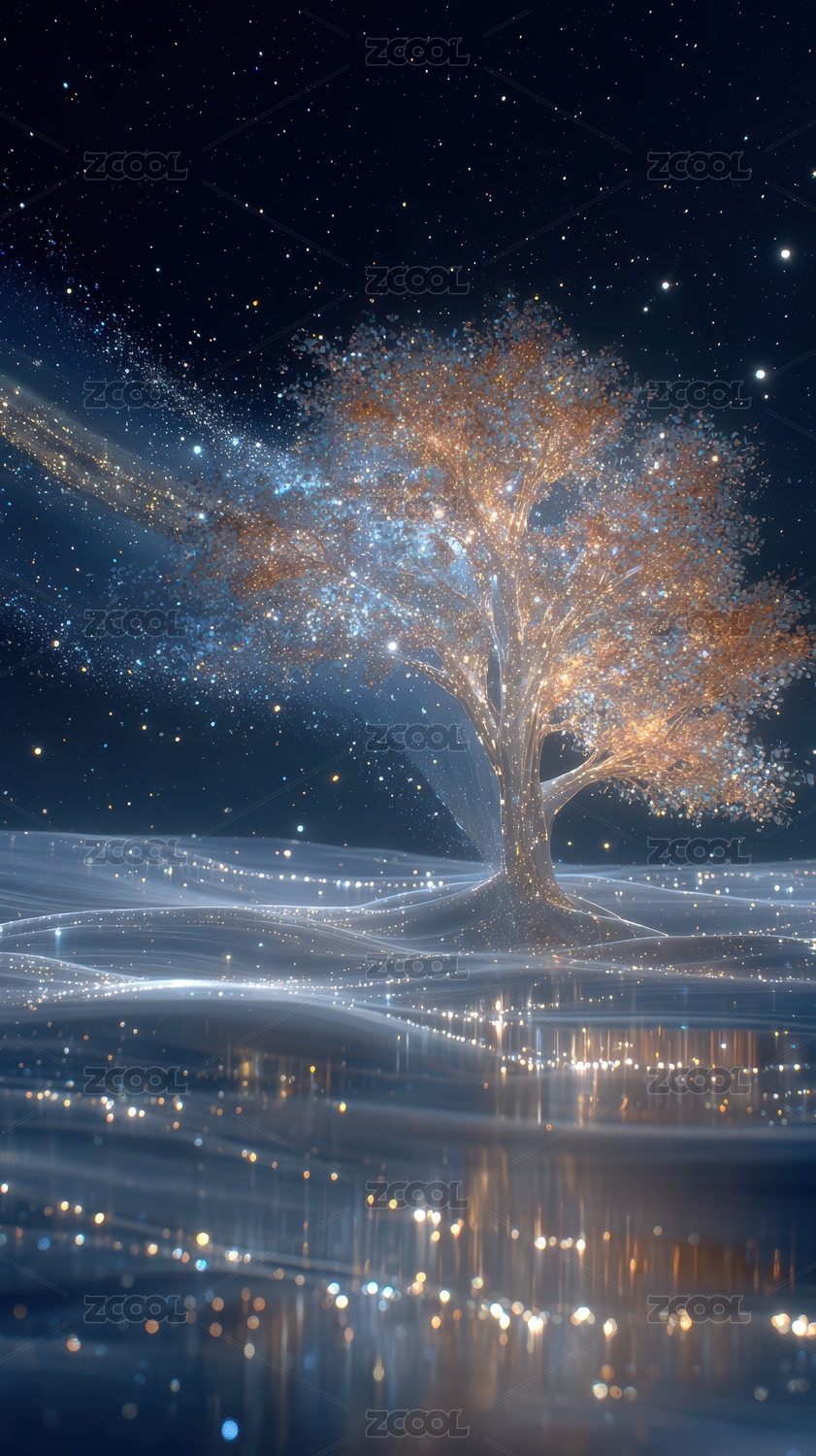 夜晚蓝色星空下流星划过,一棵挂着装饰品的许愿树倒映在波动起伏的湖面上插画背景海报