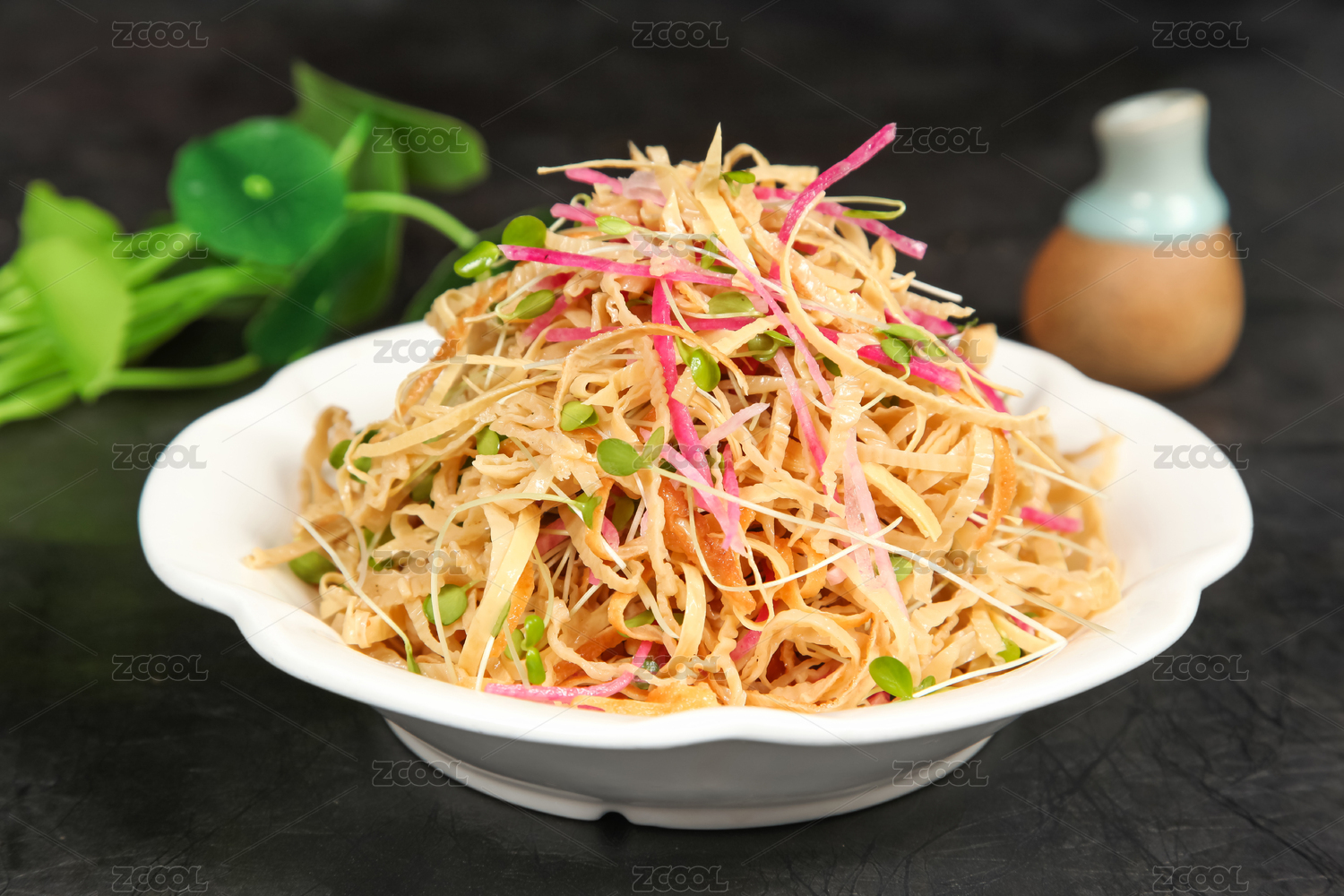 红色瓷盘装的油炸素三丝摆放在樟木砧板上