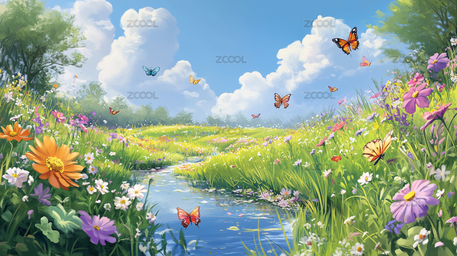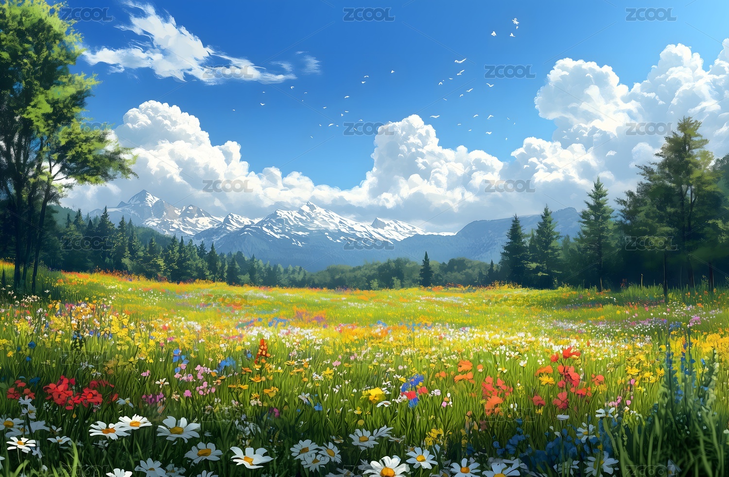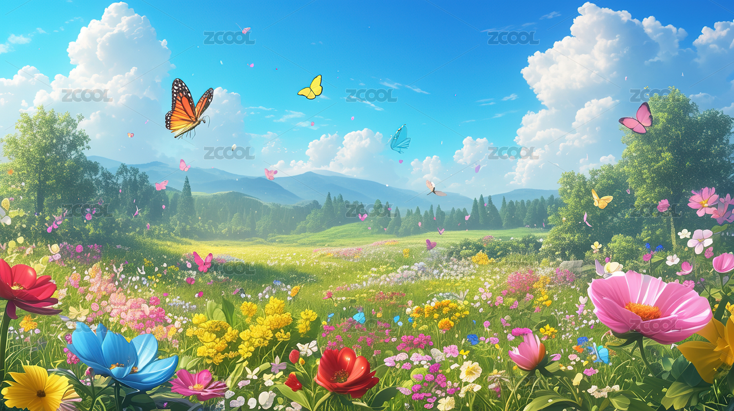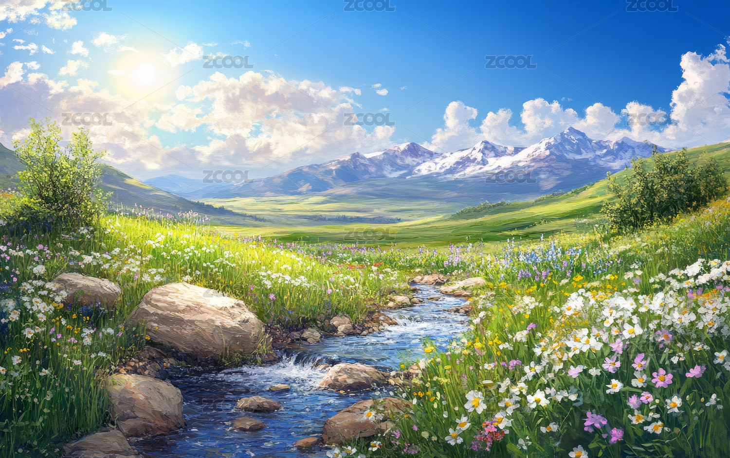 鲜花盛开山峦壮丽天空晴朗的唯美画卷