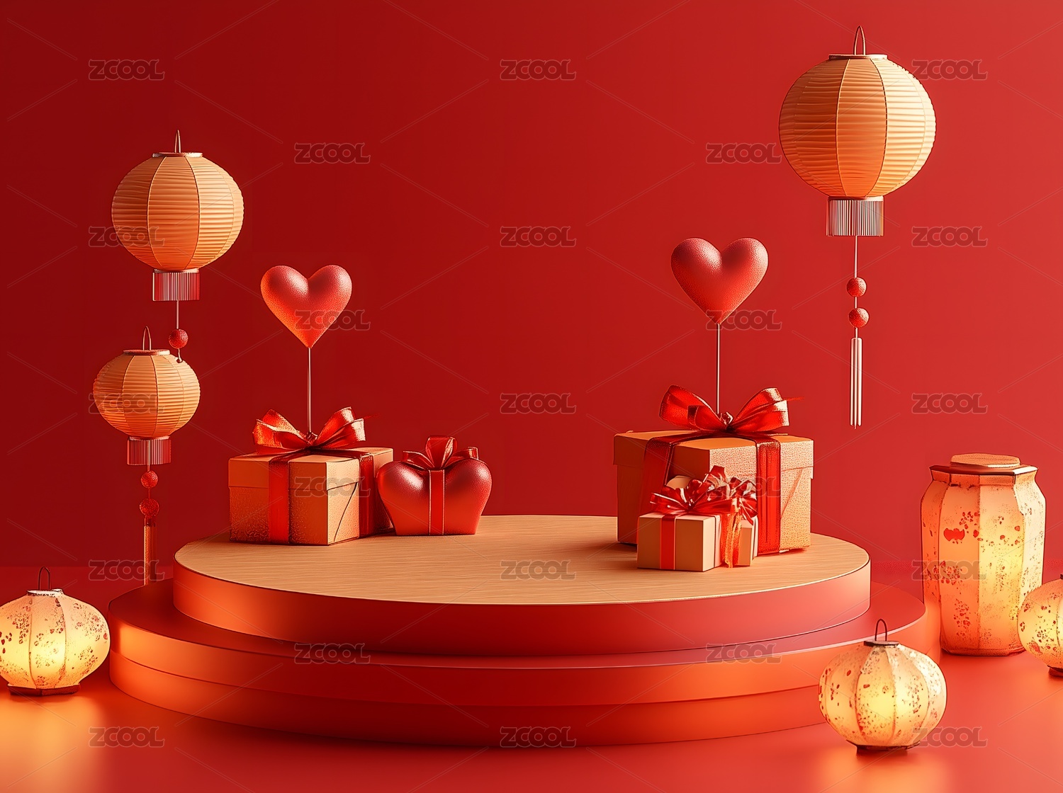 红色背景下,礼物盒与中国灯笼营造浪漫氛围