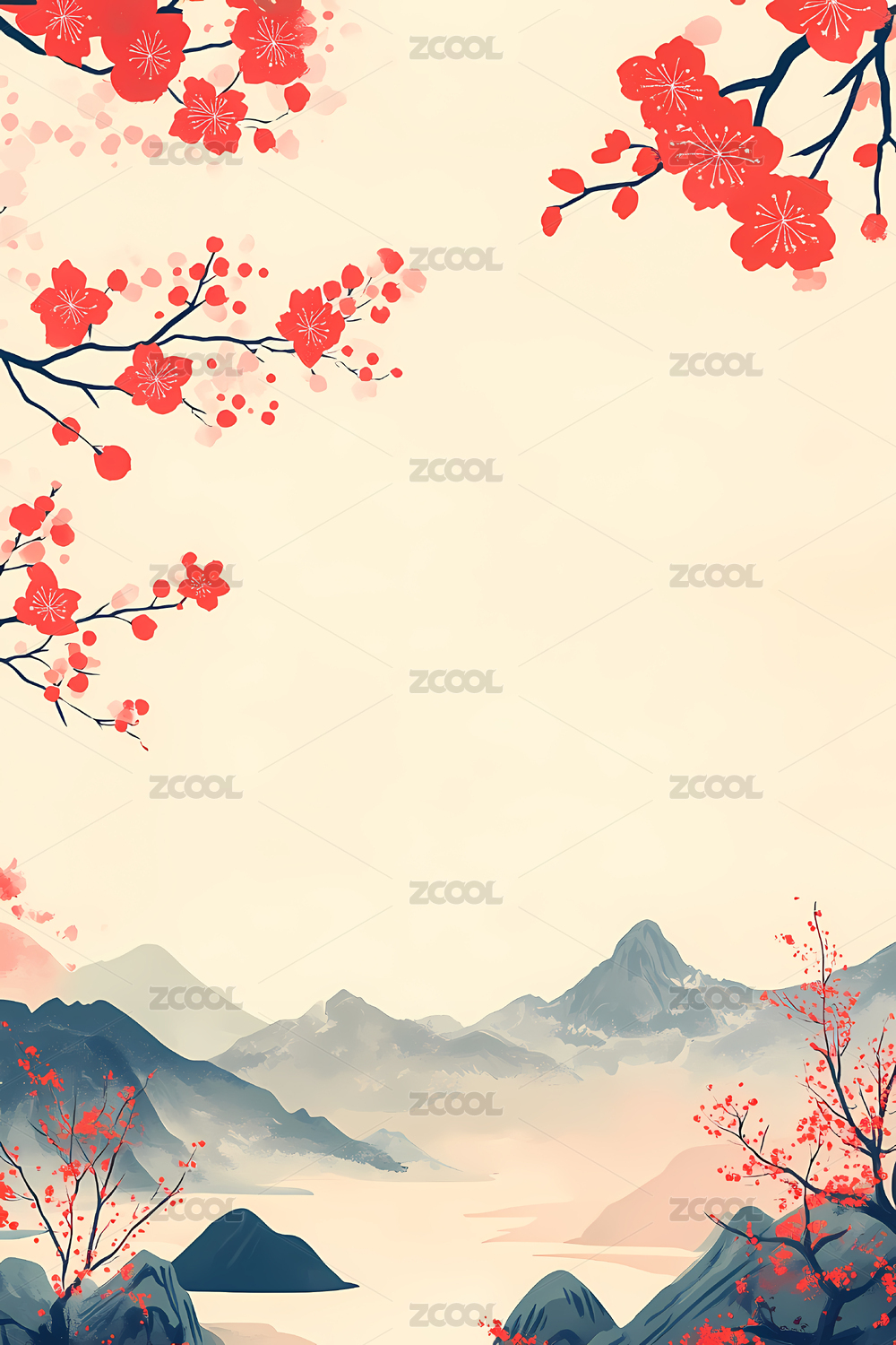 国潮古风传统中式古典彩色花朵梅花山林风景